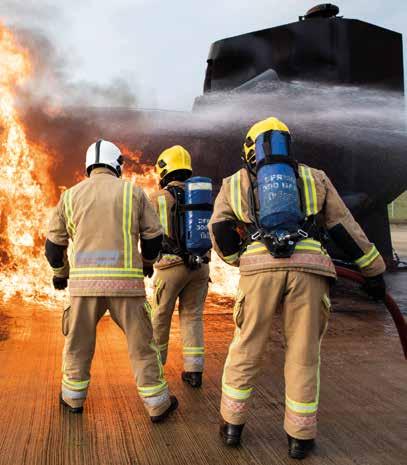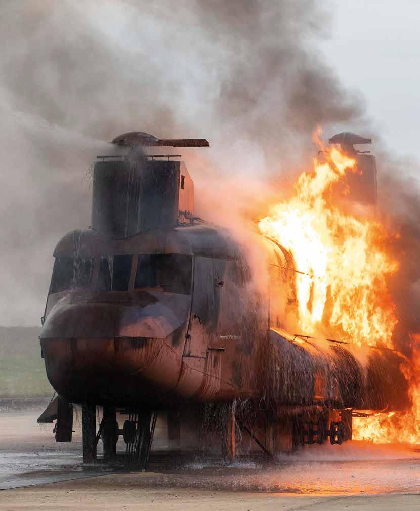 the vehicles and equipment, which include daily, weekly, or monthly checks. We carry out regular Crash (aircraft) and Domestic (building) training at our Crash Sim or Domestic Sim to keep up to date with core competencies and improve our tactics, techniques, and procedures. We also conduct specialist training such as confined space and explosive incidents. Some of these training scenarios can be seen in the action shots. A key part of our training is familiarisation of the Chinook and Kings flight helicopters. It is essential that we have a detailed understanding of aspects like danger and hazard areas,