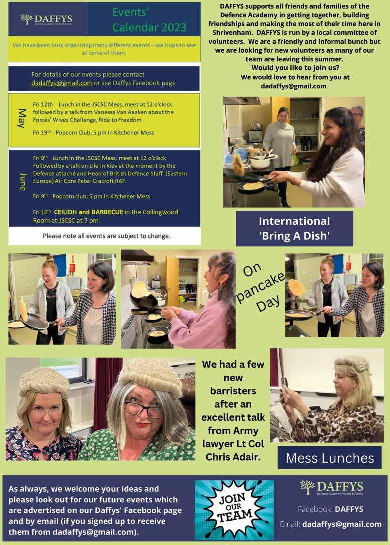 DAFFYS dadaffys@gmail.com Shrivenham Station Saddle Club 01793 785489 www.shrivenhamsaddleclub.co.uk Scouts cn@wands.org.uk www.kascouts.org.uk/wands Defence Academy Golf Club 01793 785725 Girlguiding Tuckmill ( Watchfield & Shrivenham) (Rainbows, Brownies, Guides,Rangers, Volunteering) contact jahollick1@gmail.com Defence Academy Military Wives Choir defenceacademy@militarywiveschoirs.org Academy Quilters 01793 762278 Local Services Shrivenham Village Post Office 01793 782260 Watchfield Village Hall 01793 782234 or 783157 Education Shrivenham Station Language Centre 01793 784881 Alfresco Child Care 01793 790263 The Barn Kindergarten 01793 782182 Old Station Nursery 01367 243800 Watchfield Primary School 01793 782623 Shrivenham CE Primary School 01793 782406 Longcot & Fernham Primary School 01793 782381 Shellingford Primary School 01367 710301 Faringdon Community College 01367 240375 Cranfield University Switchboard 01793 785810 Miscellaneous Main Gate Reception 01793 788270 JSCSC Reception (Main Foyer) 01793 788000 SHRIVENHAM COMMUNITY NEWS