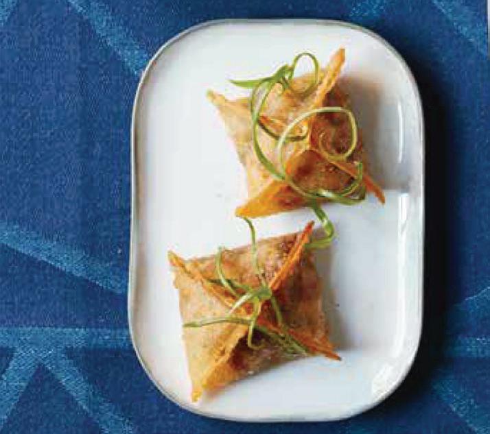 aside. Fill a small bowl with water. Unwrap the wonton wrappers and cover lightly with a piece of clingfilm to keep them moist. Lay a wrapper on a clean work surface and put 1 ounce of the meat filling in the center. Dip a forefinger into the water and run it along the edges of the wrapper to moisten the surface. Now bring the open edges to the center, and pinch where the edges meet each other, creating four seams in a cross shape. Set aside and cover with clingfilm or a damp tea towel while you shape the rest. Repeat with the remaining wrappers and filling, making sure the dumplings are not touching on the baking sheets.