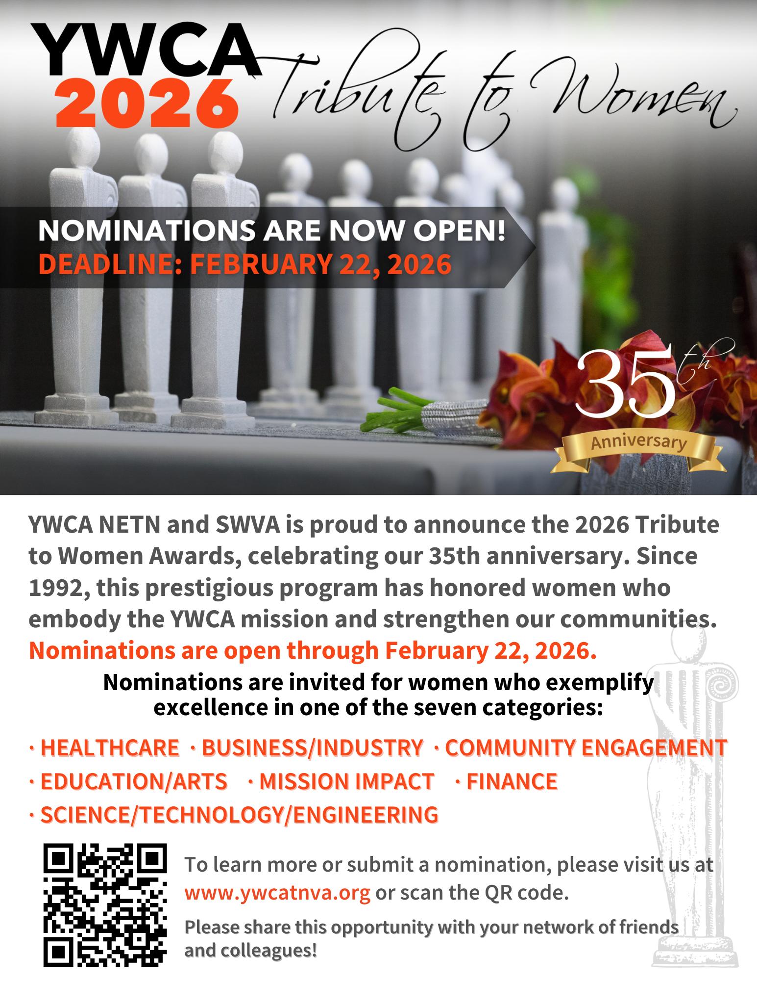 Those interested in learning more about Tribute to Women will find information on the award, as well as the nomination form and instructions, online at www. ywcatnva.org/nominations-2026 or may request information and forms by emailing tribute@ywcatnva.org or phoning 423-968-9444.