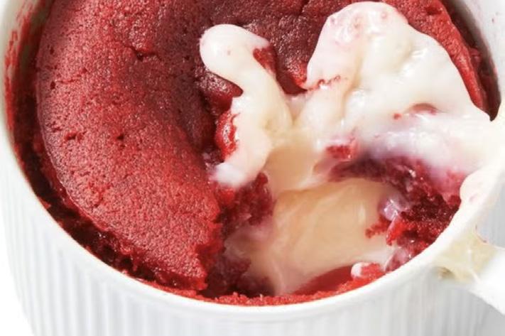 In a 12-ounce mug, whisk together flour, sugar, cocoa powder, baking powder, and salt. Stir in milk, butter, vanilla, and food coloring. In a small bowl, mix together confectioners’ sugar and cream cheese until smooth, then drop into a mug and push down until covered by batter. Microwave on High until just cooked through, about 90 seconds.
