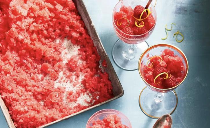 2. To serve, use fork to scrape surface of ice to create large flakes. Divide among bowls. Top with raspberries and zest, if desired.