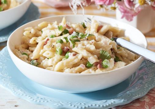 2. Meanwhile, bring a large pot of salted water to a boil over high heat. Cook the pasta 1 minute less than the package instructions. In the last 2 minutes of cooking, add the peas. Reserving at least 1 cup of pasta water, drain the pasta and peas.