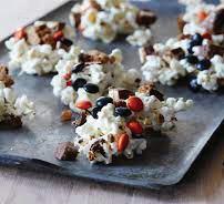 3. In a medium saucepan, heat the butter over low heat. Add the vanilla extract and marshmallows. Stir constantly until the marshmallows have melted and the mixture is smooth, about 5 minutes. Pour the melted marshmallow mixture over the popcorn. Using a spatula, sprayed with cooking spray, stir until the popcorn is coated. Spread the mixture over the prepared baking sheet. Sprinkle with the chocolate bar pieces, cookies, almonds and chocolate candies. Using a spatula, gently press the toppings into the popcorn. Allow the mixture to dry for 1 hour.