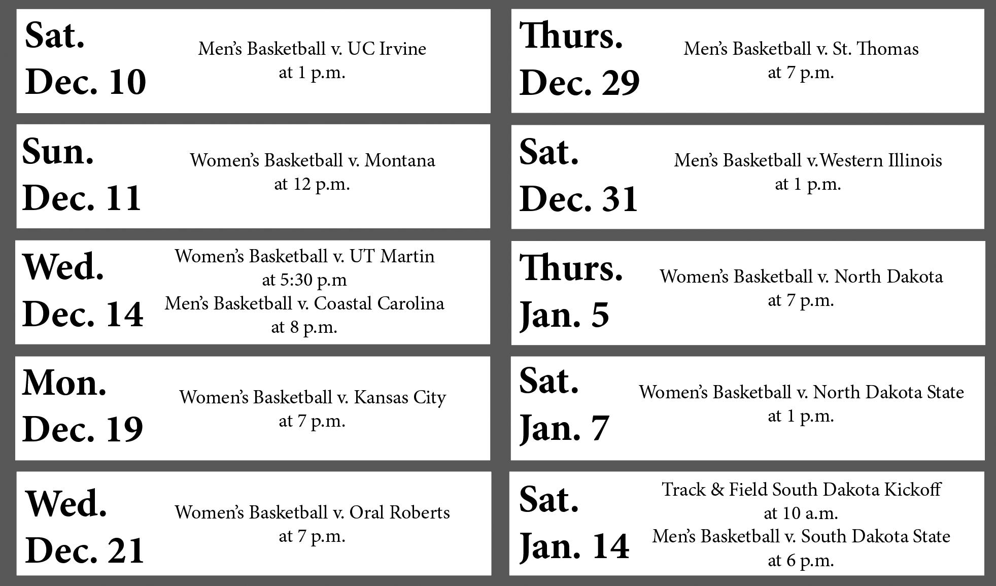The Coyotes will play four home games before hitting the road again: Montana (Dec. 11), UT Martin (Dec. 14), Kansas City (Dec. 19) and Oral Roberts (Dec. 21).