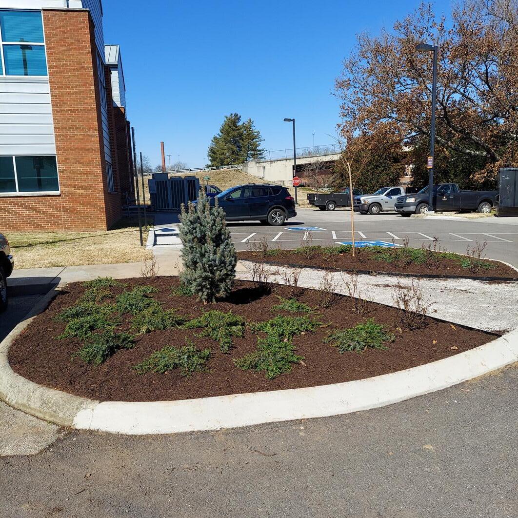 Here, one is meant to be engaged and drawn into the landscape from the greenway. I like to call these, pocket beds. The pancake arborvitae, or blue shrub, is an evergreen and will range from deep sage green to the blue color you see. Keeps it interesting and the feather grass will naturally become a dancing partner with he wind.