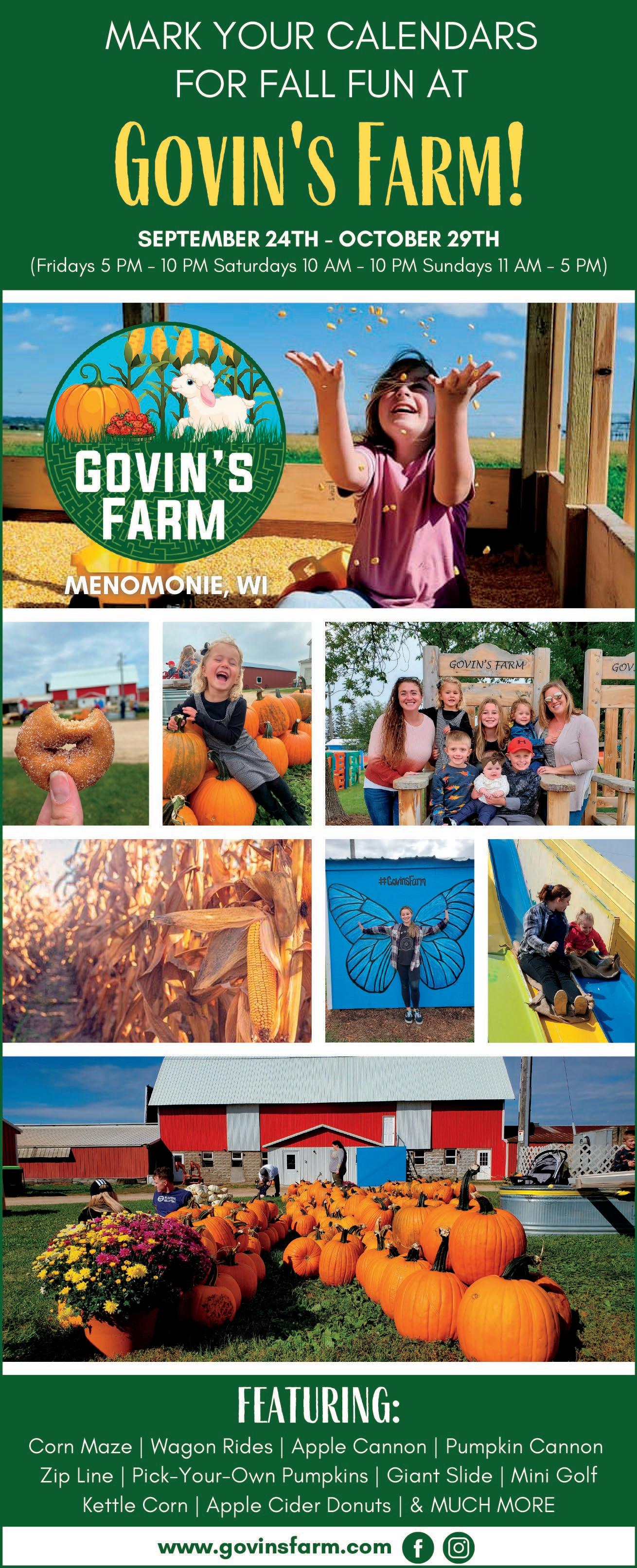 Govin’s Meats & Berries N6134 670th St, Menomonie • (715) 231-2377 • govinsmeat sandberries.com In fall, Govin’s features three full acres of pick-your-own pumpkin patch, tractor-pulled hay rides, 11-acre corn maze. They sell a variety of produce and grass-fed/range-fed meats. In Spring, their lambing barn opens to pet the cute animals. In summer, Govin's opens for strawberry picking.