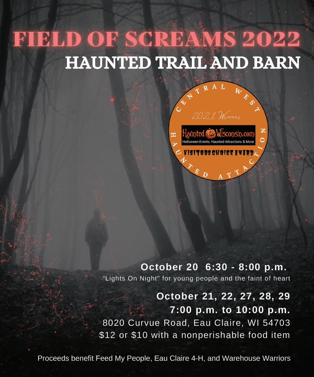Field of Screams Haunted Trial & Barn Thu-Sat from Oct. 21-29, 7-10pm • Rockin T-R Ranch, 8020 Curvue Road, Eau Claire • $12 or $10 with a nonperishable food item • Best for ages 8+ • v1ec.com/ev405229 Haunted Trail and Barn voted Best in West Central Wisconsin in 2021 by the Visitors Choice Awards by Haunted Wisconsin.