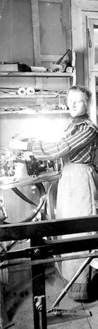 Ein St. Galler Sticker an seiner Maschine, hinter ihm stehend eine Fädlerin. Fotografie um 1910