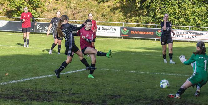 Her er det Emilia, der bringer Give foran 1-0 på et knaldhårdt skud under keeperen fra Lucas Skolen. Foto: Jim Hoff