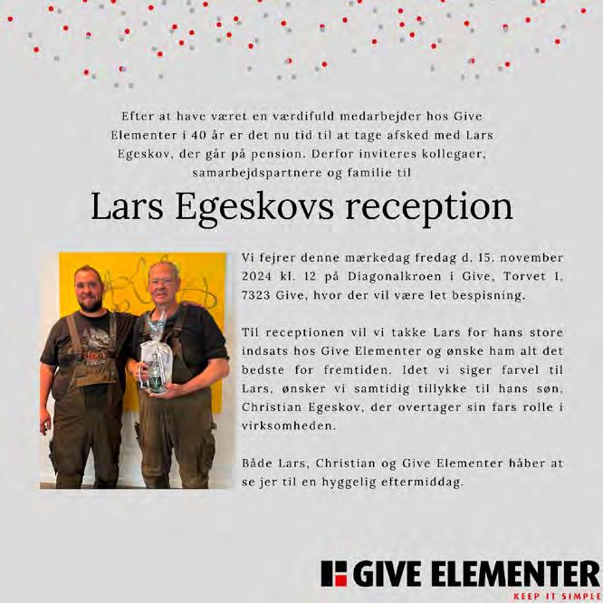 Efter at have været en værdifuld medarbejder hos Give Elementer i 40 år er det nu tid til at tage afsked med Lars Egeskov, der går på pension. Derfor inviteres kollegaer, samarbejdspartnere og familie til Lars Egeskovs reception