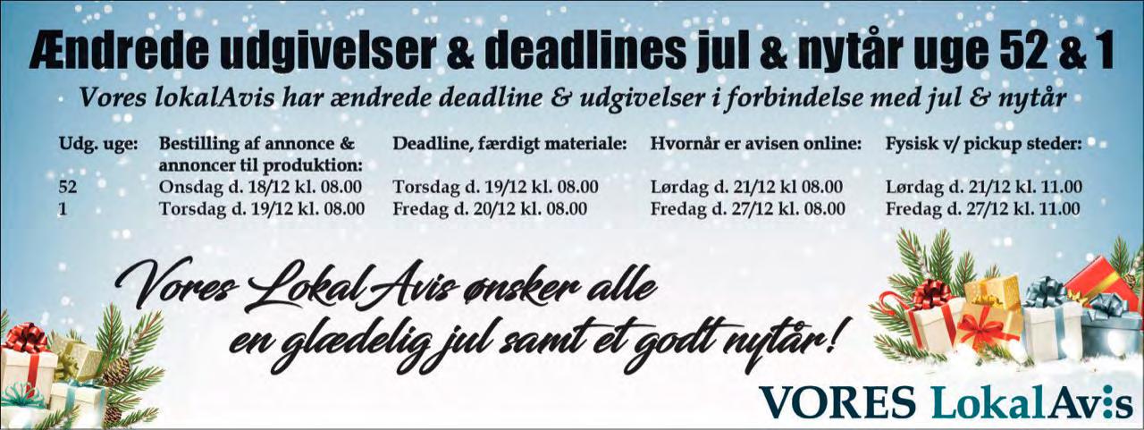 Annoncer til korrektur: Onsdag kl.15.00. Rubrikannoncer: Torsdag kl. 08.00.