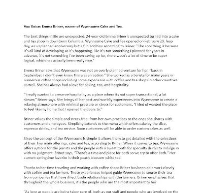 It’s said that the best things in life are unexpected. For 24-year-old Emma Briner, the unexpected was Wynnsome Cake and Tea in downtown Columbia. The shop, which opened in February, offers tea, cake by the slice and various coffee drinks — all using ethically sourced ingredients.