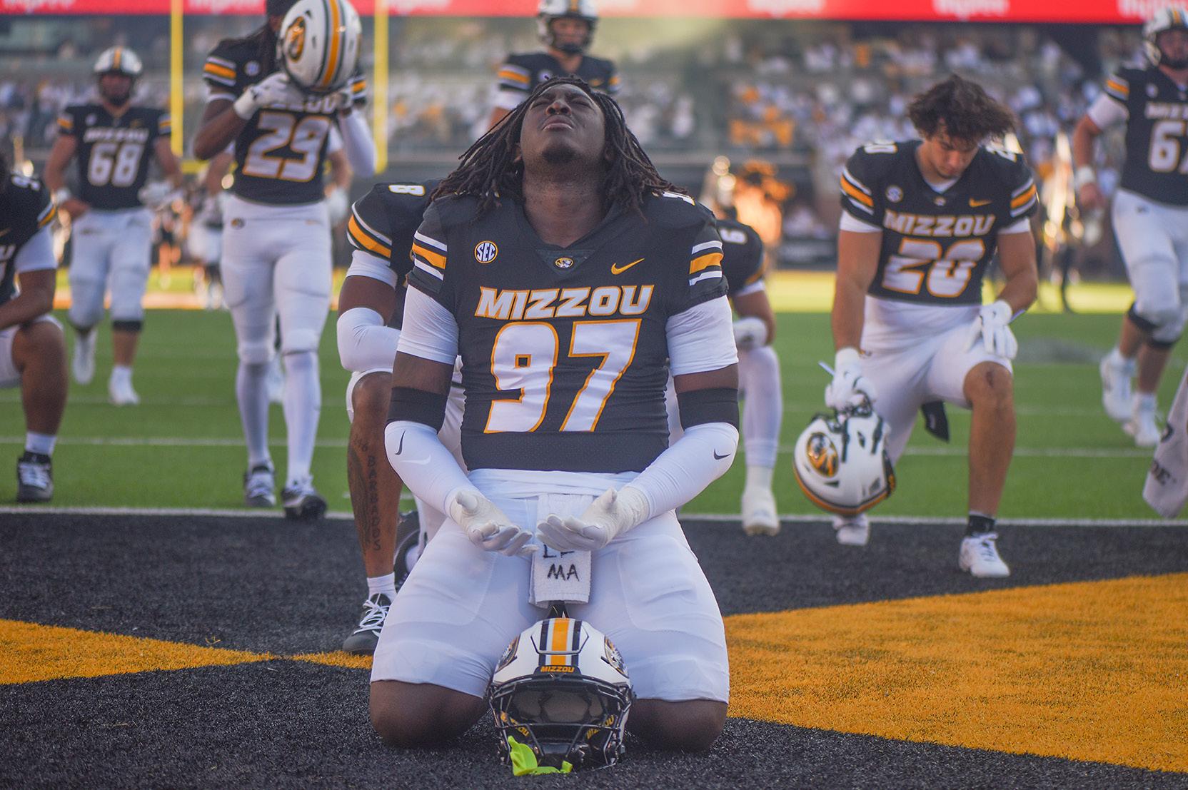 Mizzou defensive end Eddie Kelly Jr. kneels in the end zone before the game against the University of Buffalo on Sept. 7. MU football coach Eli Drinkwitz revealed after the Tigers’ 38-0 victory that Kelly’s mother had died unexpectedly on Sept. 4. Kelly was honored with the game ball because of his resilience and toughness during the difficult time. “For (Kelly) to still be here and for our team to play the way they did around him tonight — and that’s who they said they were playing for — was a special, special moment,” Drinkwitz said after the game. The wins against Buffalo and Murray State marked the Tigers’ first back-to-back shutouts since 1966, and the first time to hold two teams scoreless to start the season since 1935. In October, the lone home game will be MU’s Homecoming contest on Oct. 19 against Auburn University.