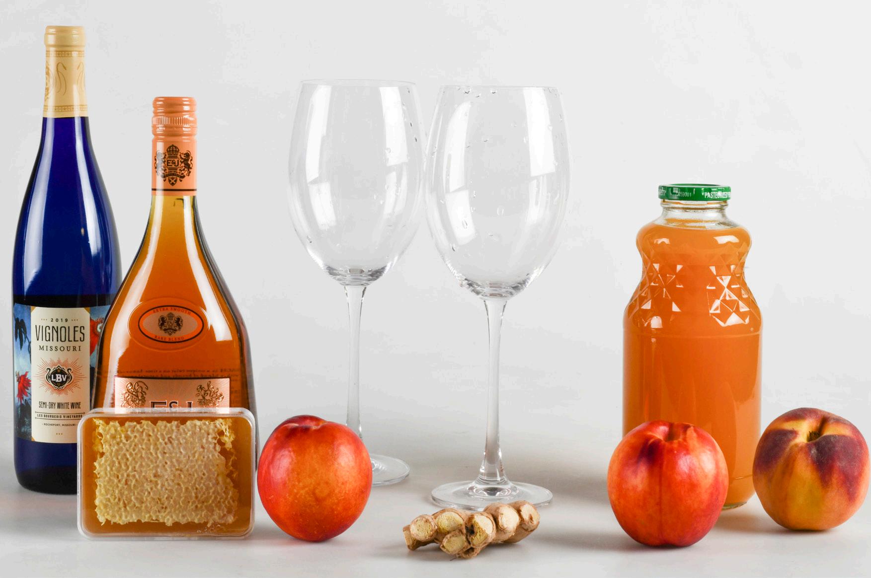 Ingredients for the peach sangria recipe include Les Bourgeois Vineyards’ Vignoles, peaches, sweetener, ginger, peach brandy and peach juice.