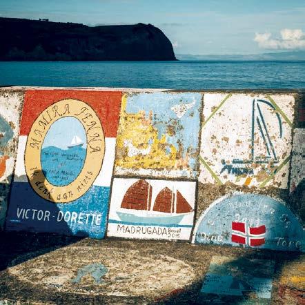 Faial au mois de mai, quand au bleu de l’océan répond l’azur des hortensias en pleine floraison. L’île se pare alors d’un tapis bleuté que l’on arpente par ses sentiers aux courbes généreuses. Pour compléter ce camaïeu naturel, la marina d’Horta rivalise d’ingéniosité avec ses trois centsembarcations multicolores et surtout ses nombreuses peintures murales laissées par les marins au fil des décennies.