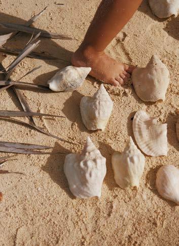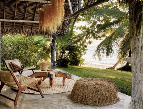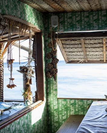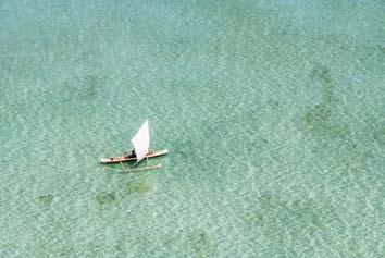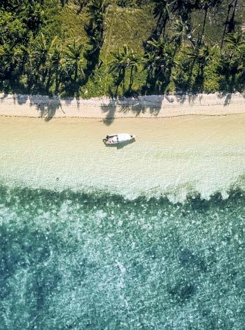 Blanc du sable, bleu transparent et changeant de la mer, vert soutenu de la végétation dé nissent un programme par la couleur. Au cœur de l’Indian Ocean, la vie se réduit à sa plus simple expression. Lire, rêver, savourer. Prendre de grandes goulées de cet air sucré typique des tropiques. Dialoguer avec les poissons ou, mieux encore, avec les requins-baleines, géants mouchetés totalement ino ensifs. À la surface, quelques dhoni, ces barques à voile traditionnelles, rappellent l’existence d’une civilisation qui, bientôt, retombe dans un oubli bienheureux.