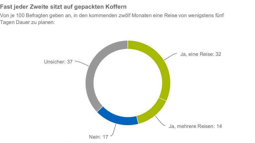 Dagegen weiß nur etwa jeder Sechste bereits, dass er in den kommenden zwölf Monaten nicht verreisen wird. 37% sind gegenwärtig noch unsicher, ob sie überhaupt verreisen oder unentschlossen, wo sie dieses Jahr ihren Urlaub verbringen werden.