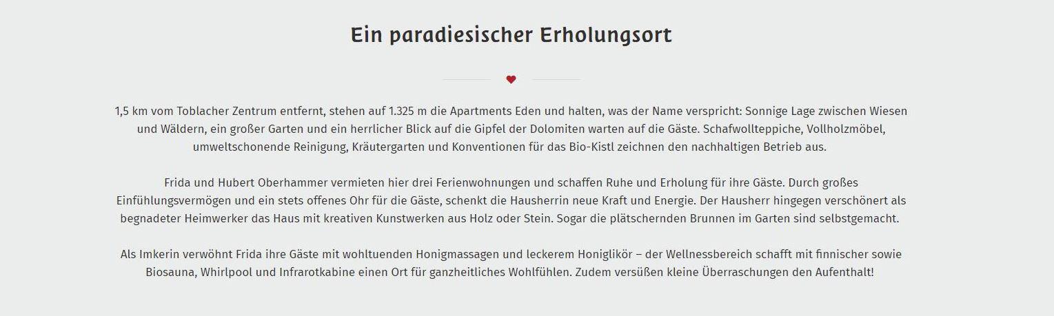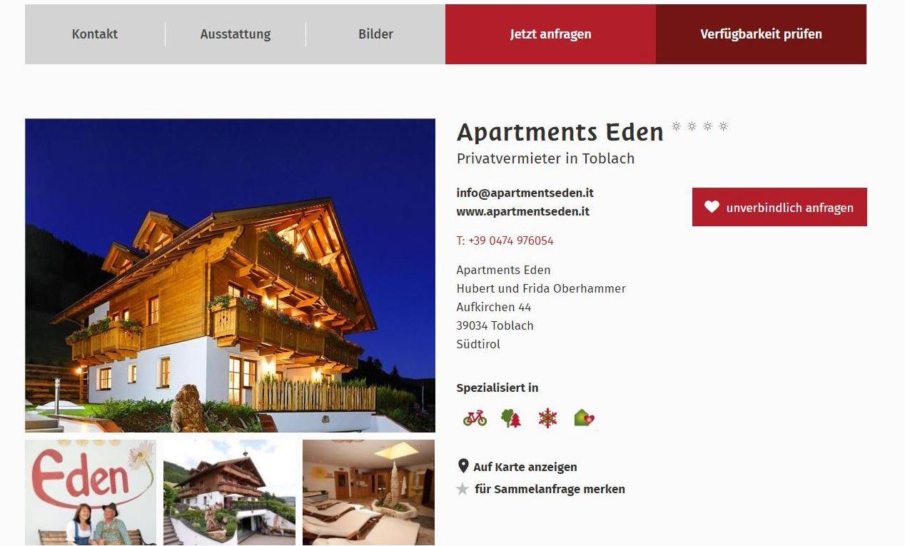 • Präsenz auf der Website unserer Marketinggruppe www.suedtirolprivat. com (sofern in TIC-Web eingetragen),