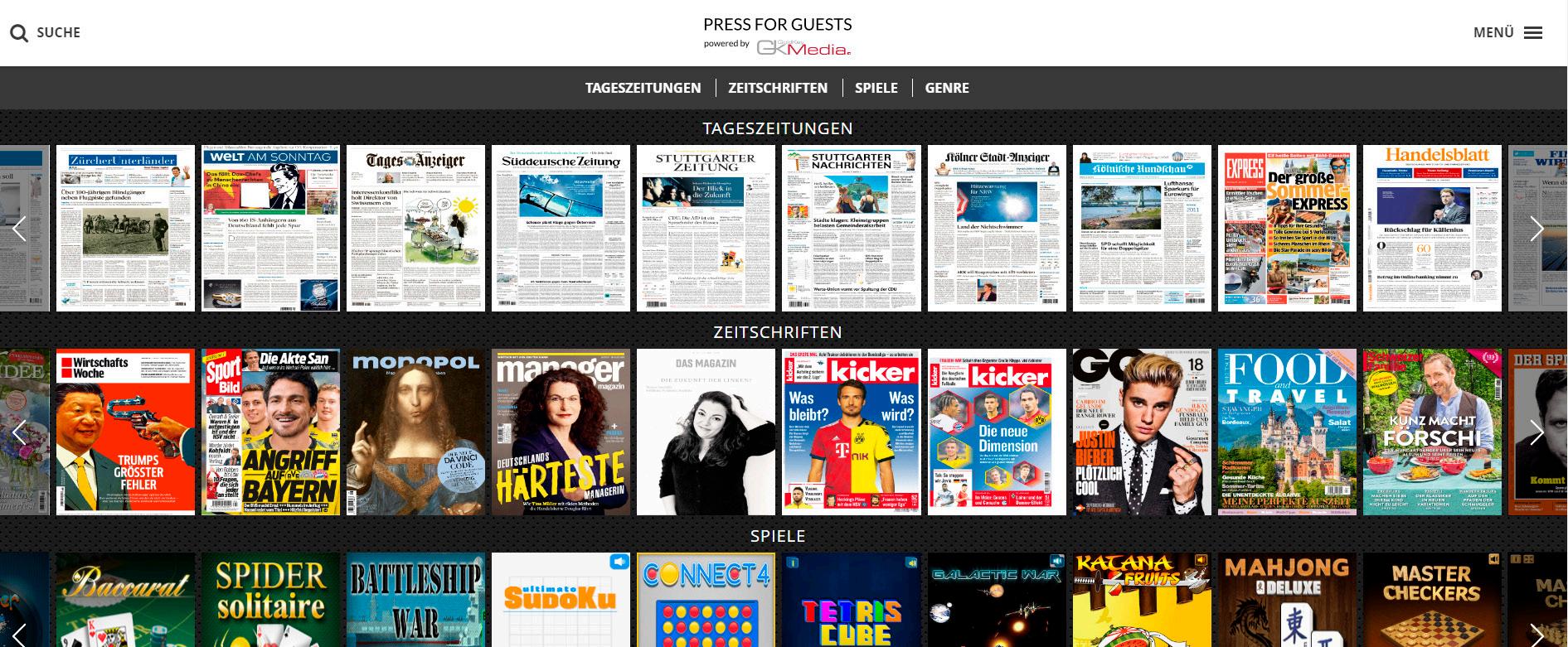 gabe. Zur Auswahl stehen Tageszeitungen wie die Süddeutsche Zeitung, Der Standard, La Stampa, La Repubblica, The Guardian und The Times, Wochenzeitungen wie Die Zeit, aber auch Magazine aus allen Interessenbereichen wie Der Spiegel, WirtschaftsWoche, Kicker oder Donna, Cosmopolitan, Men’s Health oder GQ.