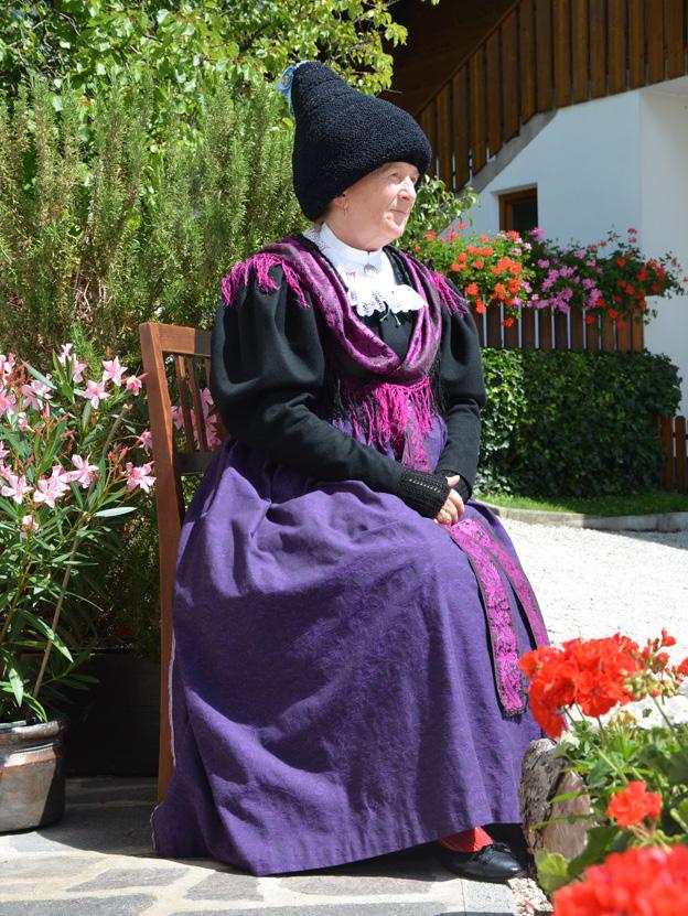 Eine Tracht, die’s in sich hat! Emma Pigneter vom Gästehaus Pigneter in Völs ist eine Frau, die sich glücklich schätzen darf. Sie hat ihre Tracht von ihrer Mutter geerbt und diese wiederum ebenfalls von ihrer Mutter. Emma trägt ihre Tracht mit Stolz. Zu jedem Feiertag holt sie Kleid und Zubehör aus dem Schrank. Es handelt sich dabei nicht um irgendeine Tracht, sondern um eines der ältesten Exemplare im Schlerngebiet. „Wenn man so etwas Kostbares besitzt, muss man auch darauf Acht geben“, weiß Emma. Ja stimmt, die Farben und Muster sind noch wunderbar erhalten, nach über 100 Jahren. „Hier, siehst du den schwarzen Plisseerock? Die Falten nähe ich jeden Herbst nach der letzten Prozession von Hand zusammen, damit ich sie im Frühjahr vor der ersten wieder auftrennen kann und der Rock seine Form nicht verliert.“