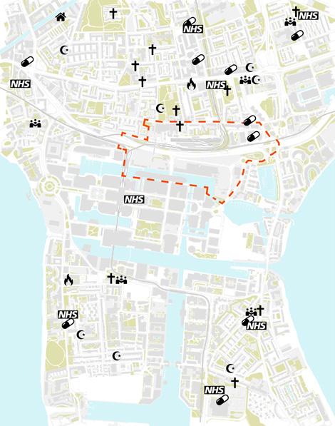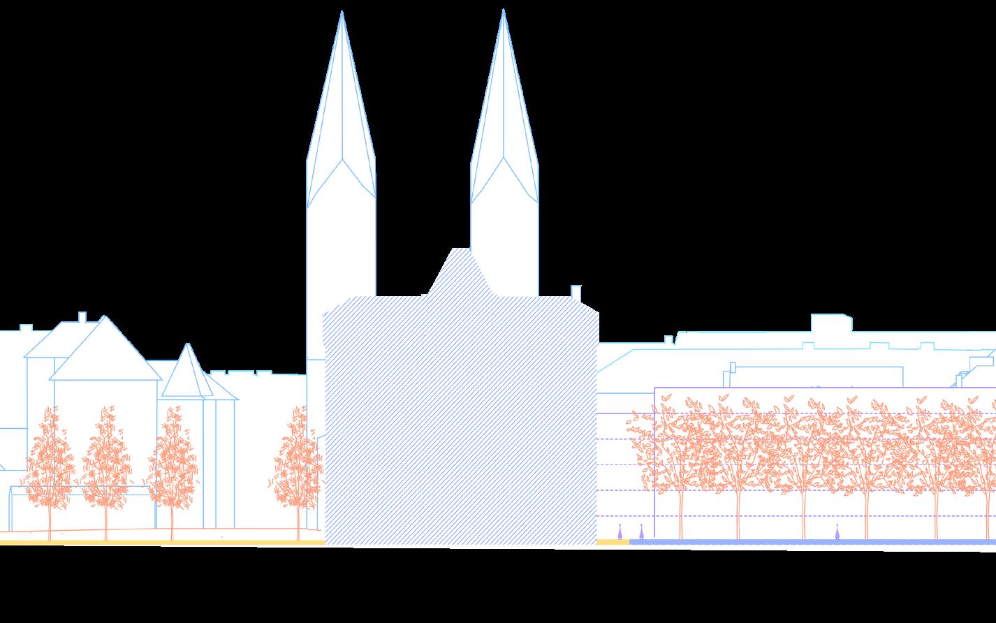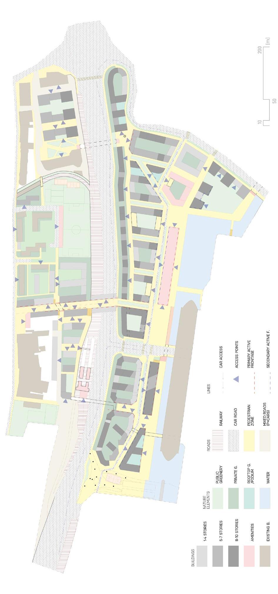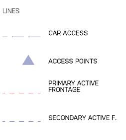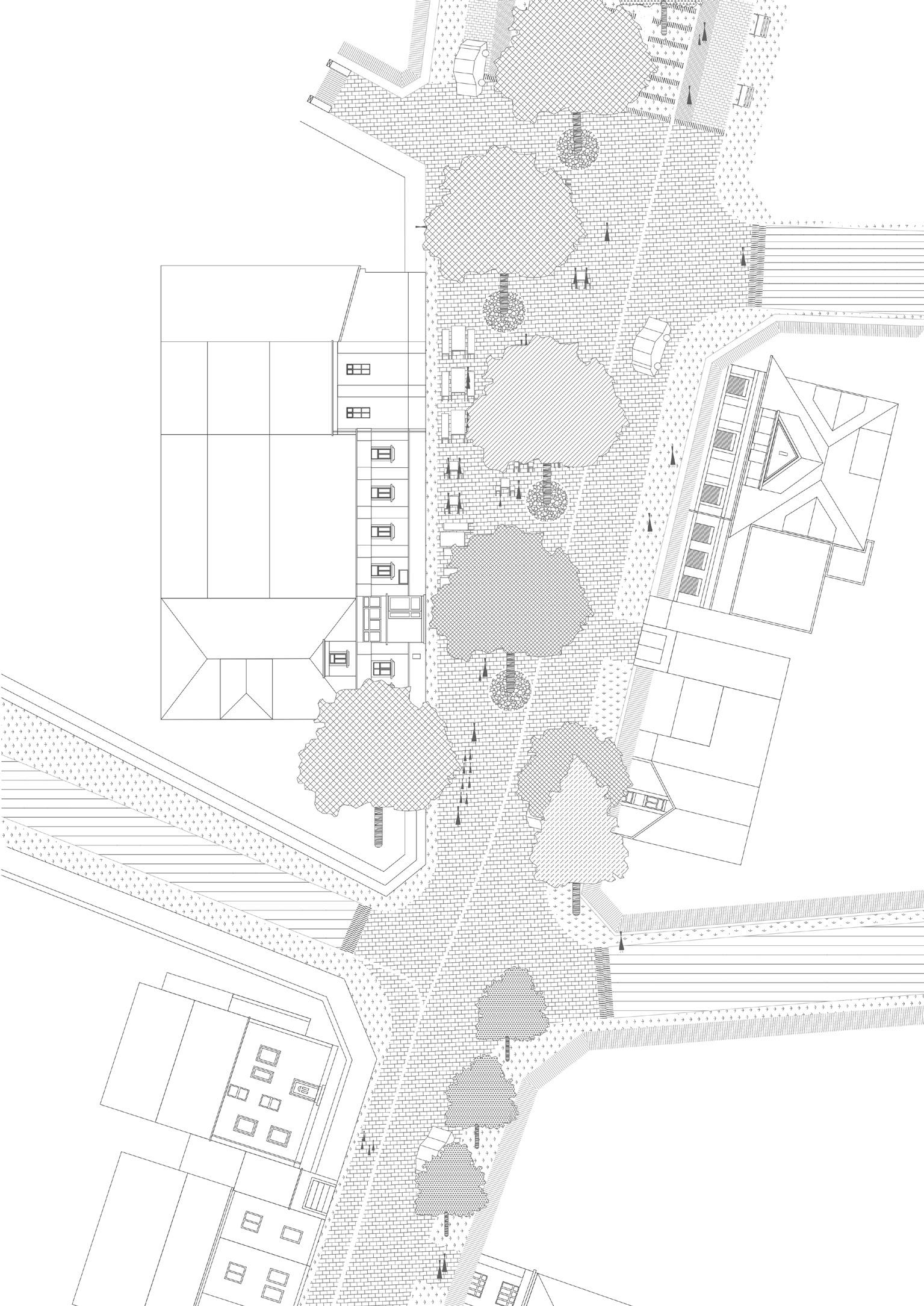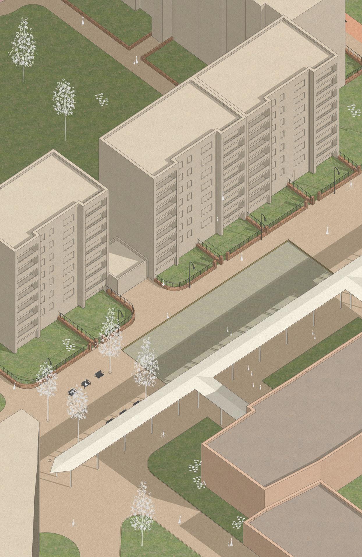 proposition tries to work with the height differences caused by roads rising up Canary Wharf by using sloped streets, maintaining the maximum level of accessibility for everyone while also establishing uninterrupted spaces to walk through Majority of the proposed streets in the south are pedestrian zones, mixing pedestrians together. Car access route is proposed in the central boulevard also a pedestrian zone, to allow deliveries and supplying necessary for the hall, school, shops and residential uses, with short-time parking in the street. residential buildings is not proposed in individual buildings but it is located north-eastern corner with direct connection to the Aspen Way for the whole development. Important is also the introduction of greenery into the streetsprivate and public, helping to cool the cities down in the summer and establishing of local people in caring for their surroundings thus increasing street safety.