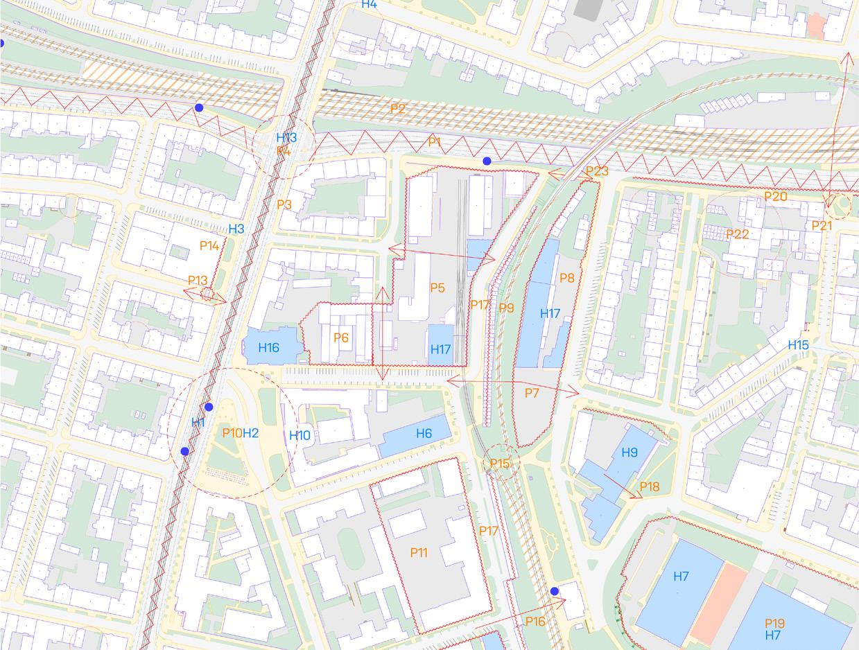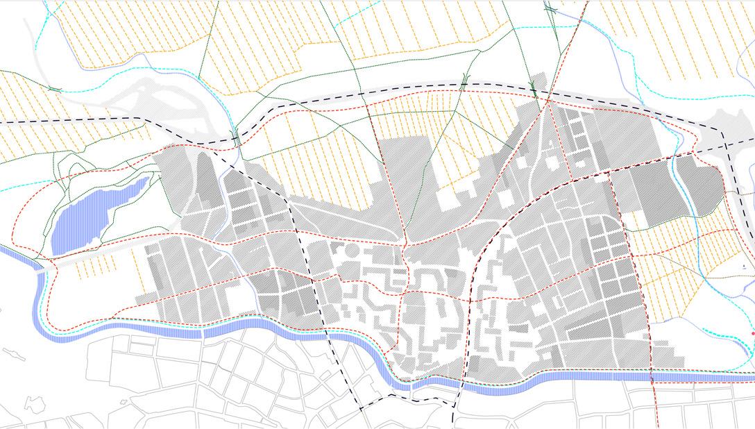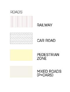 světle šedé bloky –stávající / light grey blocks –existing tmavě šedé bloky –nové / dark grey blocks –proposed čárkovaná černá –hlavní tahy / black dashed –major roads červená –cyklostezky / red –cycslopaths zelená –obnovené historické cesty / green –restored historic paths