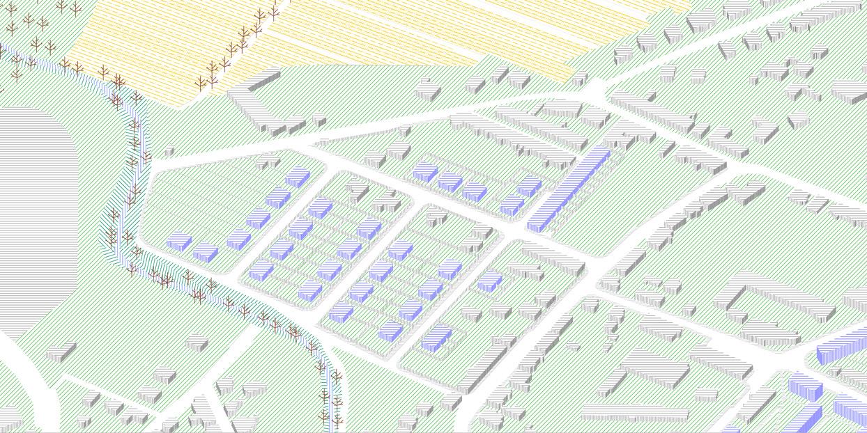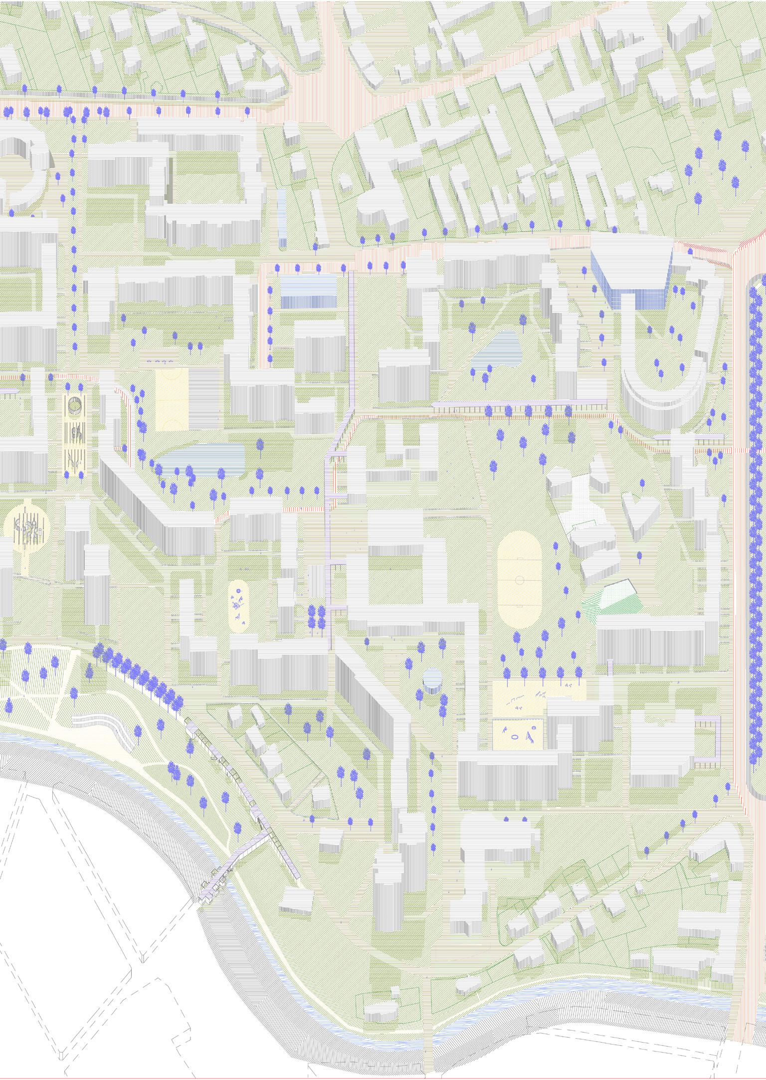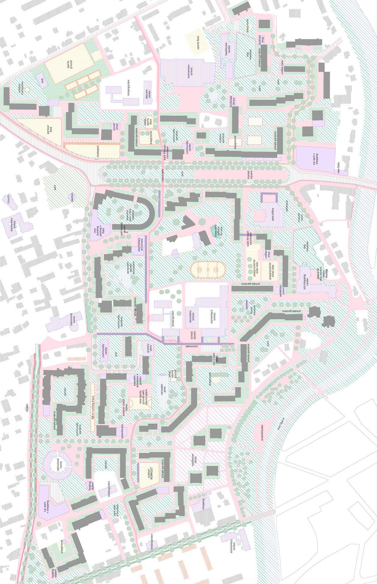 This studio assignment was the Opava city, in detail, the part of the city situated on the north bank of the Opava river. This area is characterized mainly by a development undergone in 1970´s when the original urban structure was demolished and replaced by modernist housing estate. Today is the area perceived negatively by local people and faces neglect alongside with decreasing quality of life. Our work is divided into 3 scales: macro, mezzo, and micro. The Macro scale is mainly dealing with overall organization of the city and ´plugging in´ our design into it. Its concerns are green infrastructure, landscape and its permeability, traffic and zoning. The Mezzo scale is dealing with the assigned part of the city: public transport, parks and proposed new development and amenities. The Micro scale deals with the mentioned housing estate ´Kateřinky´ in detail and its possible transformation into the original modernist idea of high-quality living in the green. In the Macro scale, we coordinate our designs with other urbanism students to propose a Green belt which is meant to establish a clear division and stop the urban sprawl. In our part of the city, this belt is located the closest to the existing development. We wanted to create more pressure towards using brownfield areas which are many present in the city, and towards densification in currently very low-density city. Because of the compact city size, we mainly encourage public transport and cycling. In our design we also propose a riparian forest, located in the south-eastern corner of assigned area, linked to the Opava river and re-established creek. This area is currently meant for individual housing development by the city. In the greatest detail we are dealing with the Kateřinky housing estate with the highest density in all Opava city but lowest number of amenities caused by lack of different functions than housing, traffic and leftover greenery.