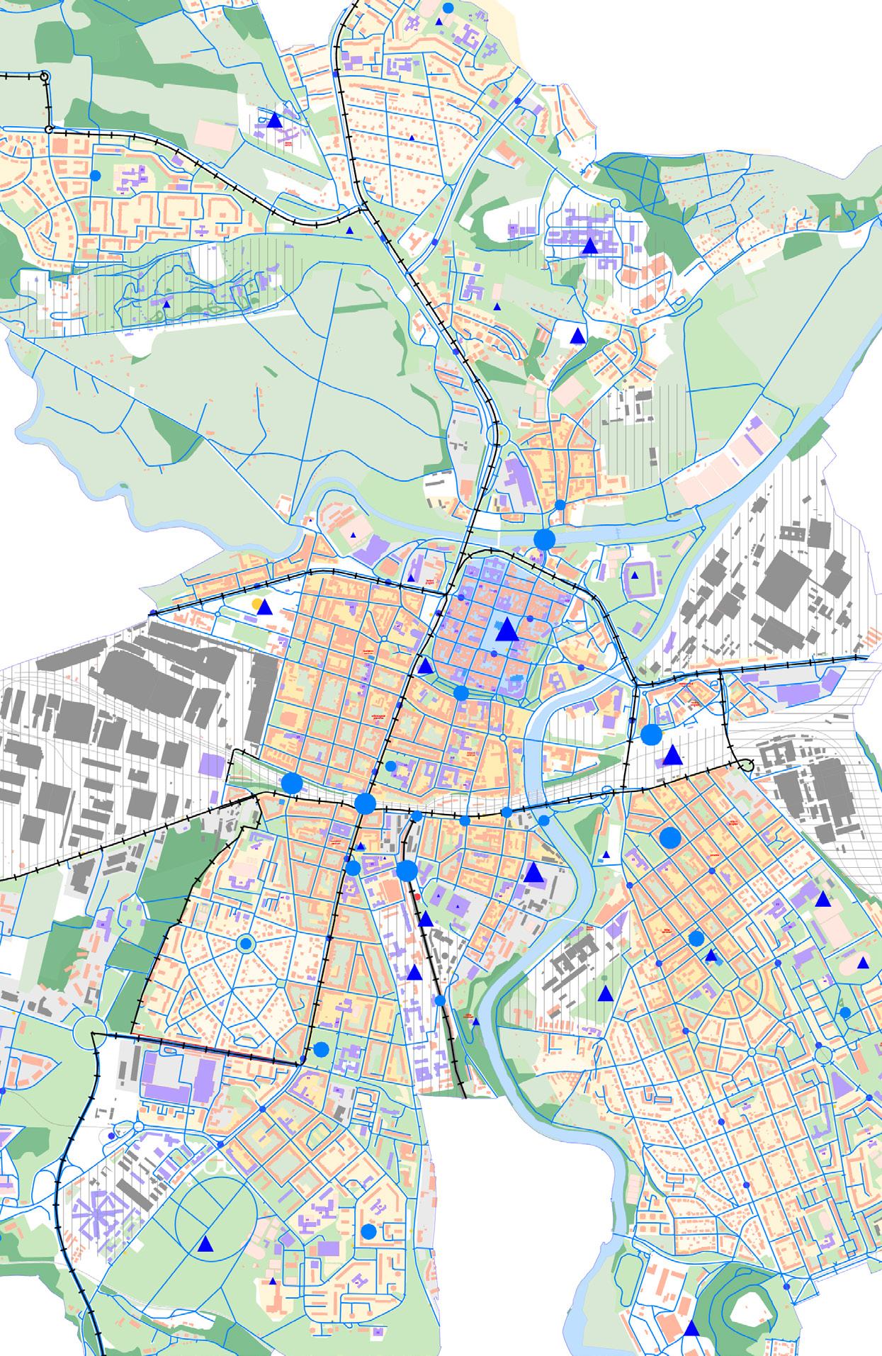 světle oranžová –30 os/ha / light orange –30 people/ha středně oranžová –40 os/ha / medium orange –40 people/ha tmavě oranžová –70 os/ha / dark orange –70 people/ha červená –90 os/ha / red –90 people/ha modrá –voda / blue –water fialová –nově navržená vybavenost / violet –proposed amenities žlutáindustriální plochy / yellowindustrial areas