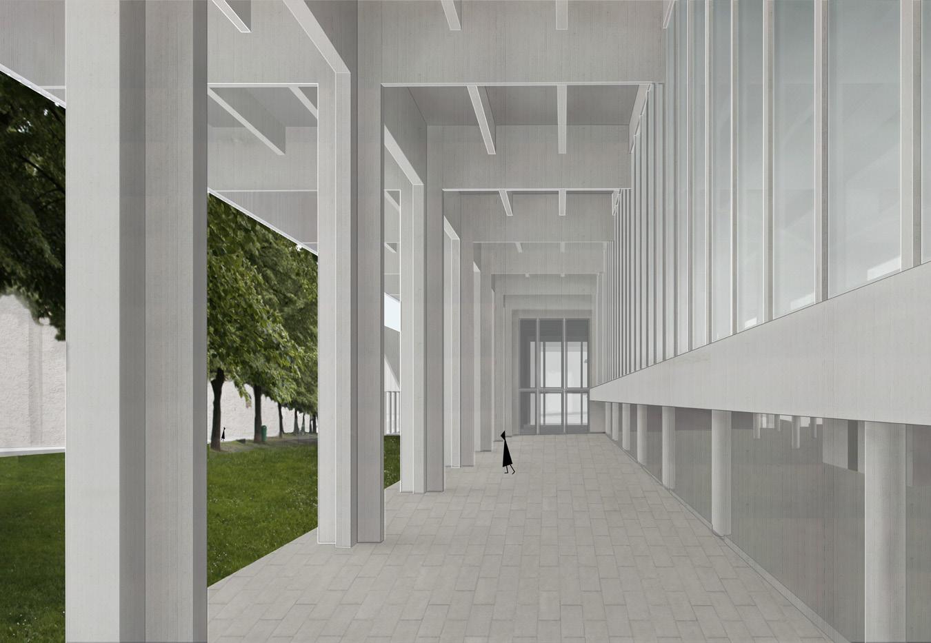 Dnešní Lannova je zmatené místo. Park, zahloubená rušná komunikace, Letná, Staré město. Vše se zde střetává, ale zároveň uzavírá. Neexistují zde vazby, spojením je snad jen pohled na letenský svah. Ve snaze vytvořit smíření těchto prvků, zde navrhuji menší budovu veřejné kulturní instituce. Dopravní situace vychází ze studie AOC s menšími úpravami, díky srovnanému terénu dochází k propojení prvků, vyvážení vztahu chodec/automobil a lepší přehlednosti. Po obou stranách komunikace navrhuji aleje. Podlouhlá hmota galerie tvoří clonu mezi ruchem této komunikace a parkem. Zelený plac přiléhá ke galerii z jihu, druhá část parku za křížením je ponechána nezměněná. Sama galerie současného umění je budovou, která se snaží vytvářet pouze volný prostor. Záměrem bylo umožnit umělci nakládat s ním jakkoli uzná za vhodné. Venkovní výstavní prostory, prosklená galerie v prvním patře a velká výstavní hala s horním denním osvětlením v patře druhém. Výraz budovy má pevný řád tvořen konstrukcí, narušený lehkou hrou ve formě vystrčení kavárny směrem do parku. Primární snahou bylo vytvořit co nejsvobodnější prostor urbanisticky dotvářející struktury Lannovy.