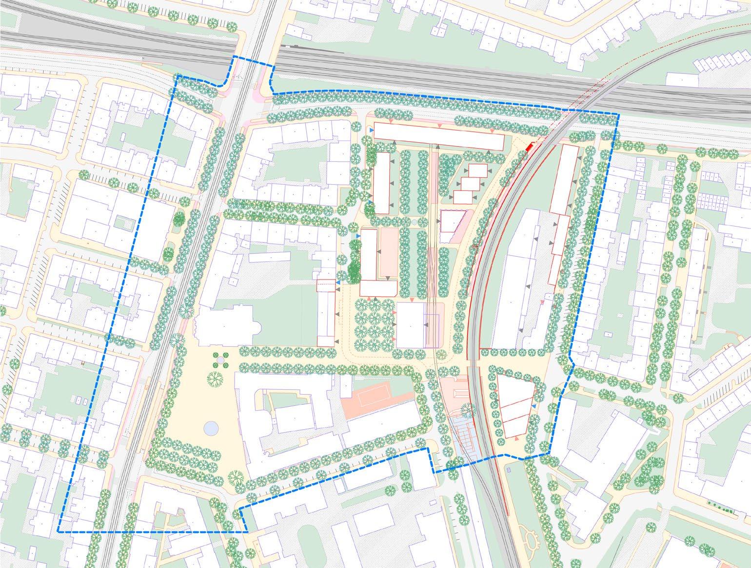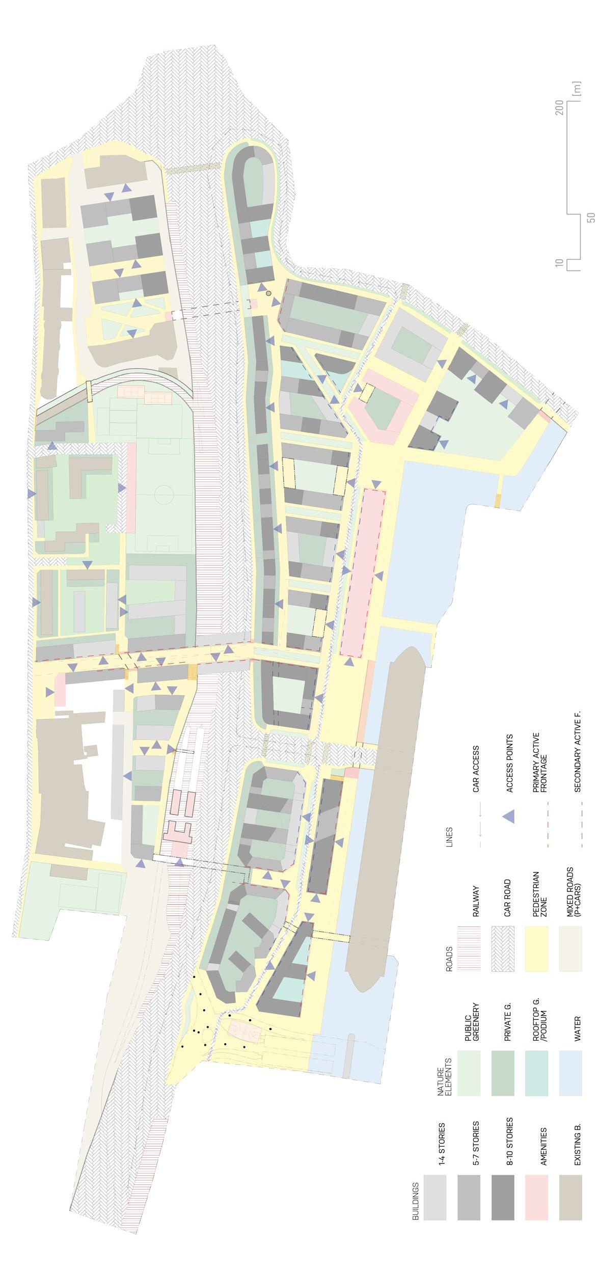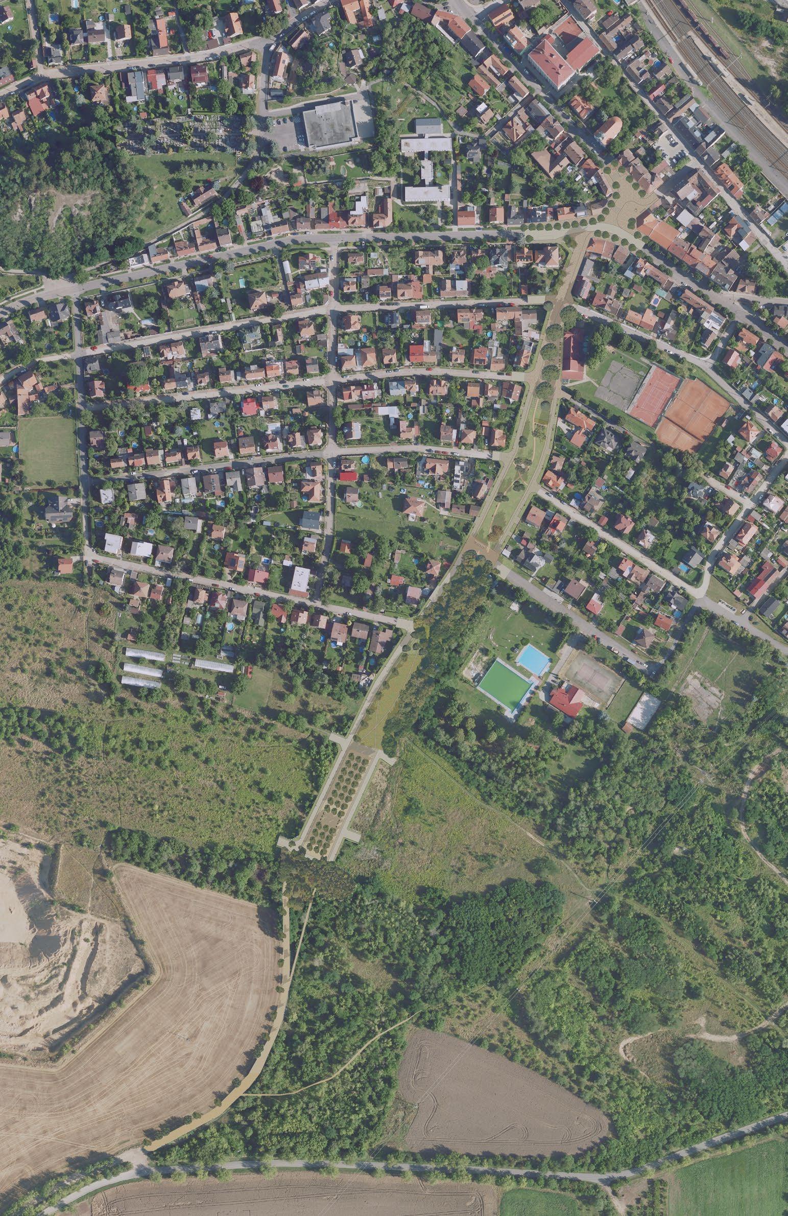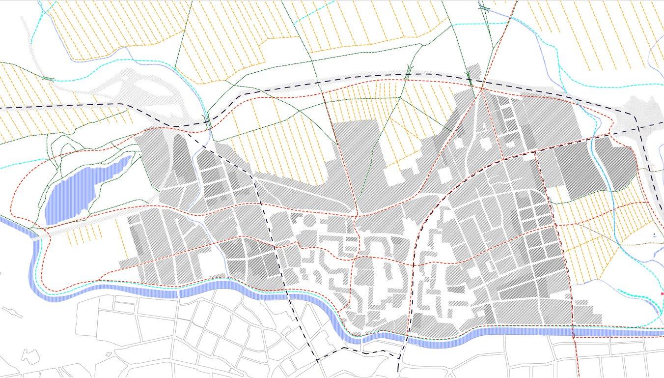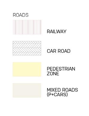 světle šedé bloky –stávající / light grey blocks –existing tmavě šedé bloky –nové / dark grey blocks –proposed čárkovaná černá –hlavní tahy / black dashed –major roads červená –cyklostezky / red –cycslopaths zelená –obnovené historické cesty / green –restored historic paths