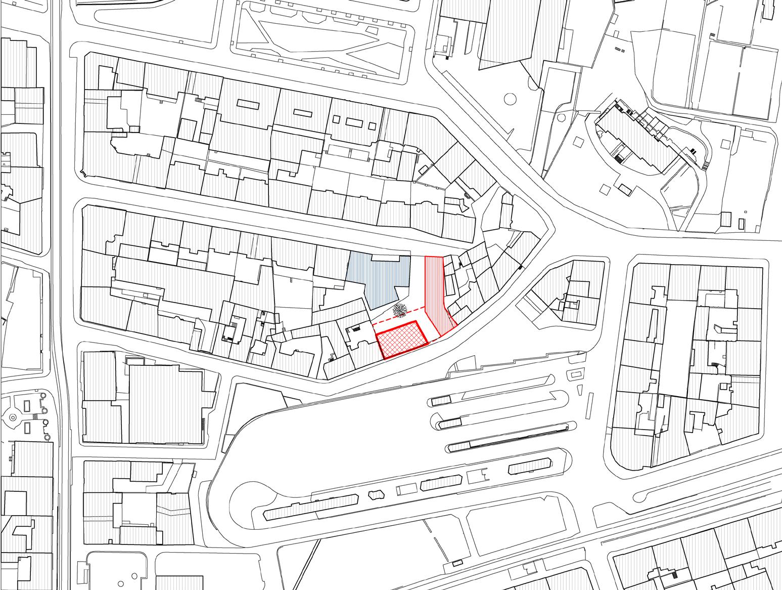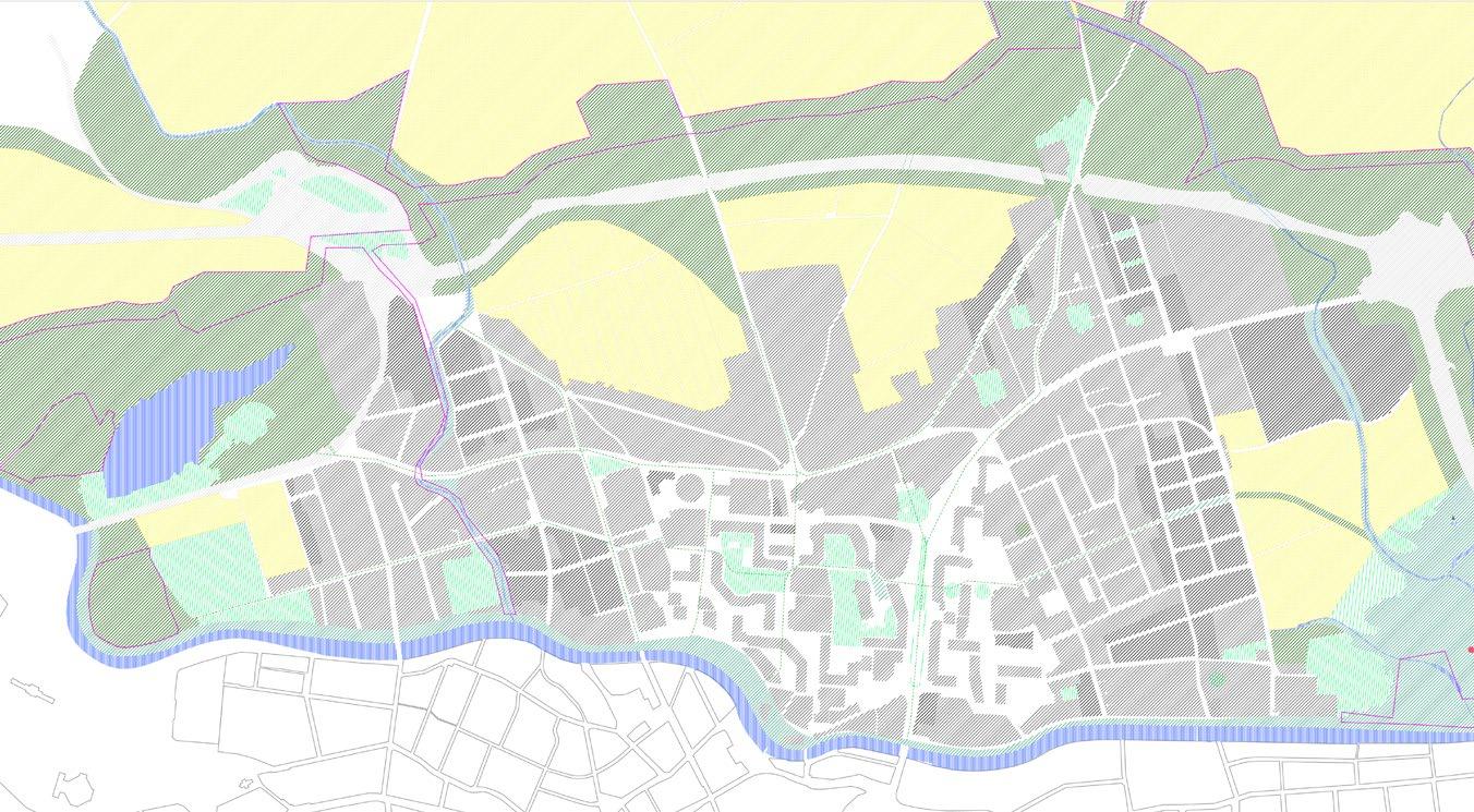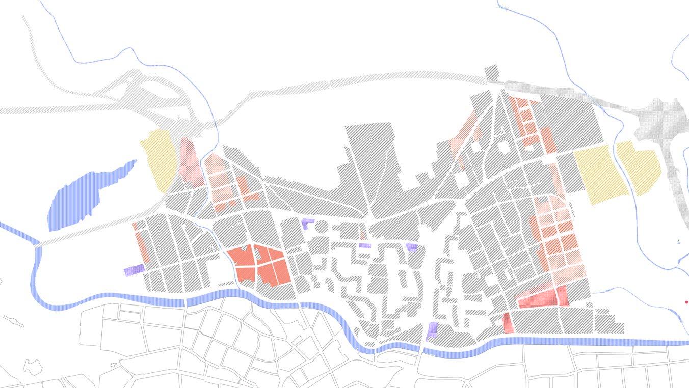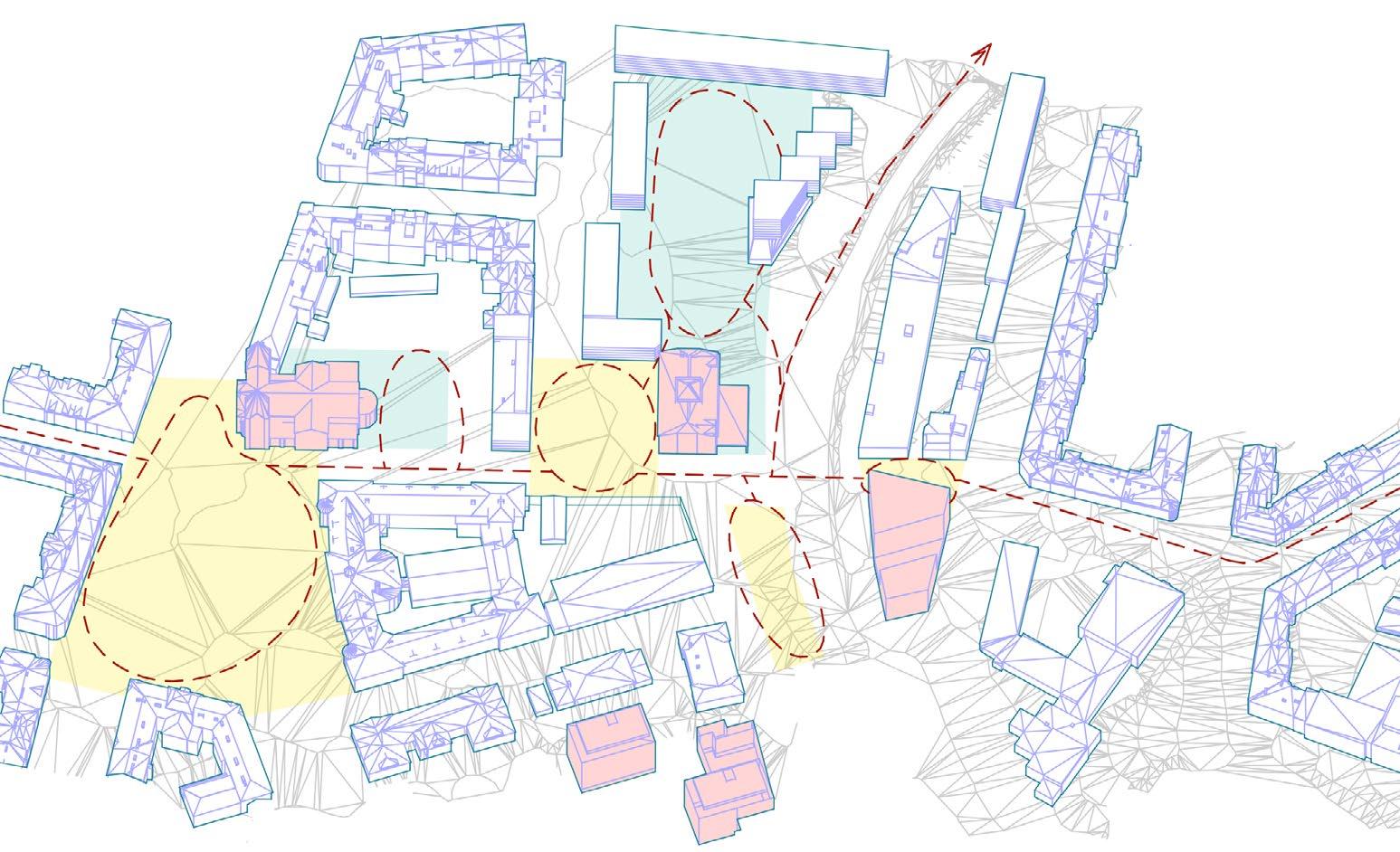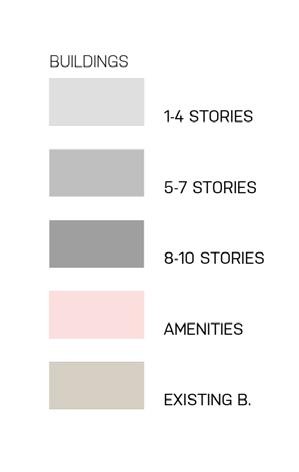 světle šedé bloky –stávající / light grey blocks –existing tmavě šedé bloky –nové / dark grey blocks –proposed čárkovaná černá –hlavní tahy / black dashed –major roads červená –cyklostezky / red –cycslopaths zelená –obnovené historické cesty / green –restored historic paths