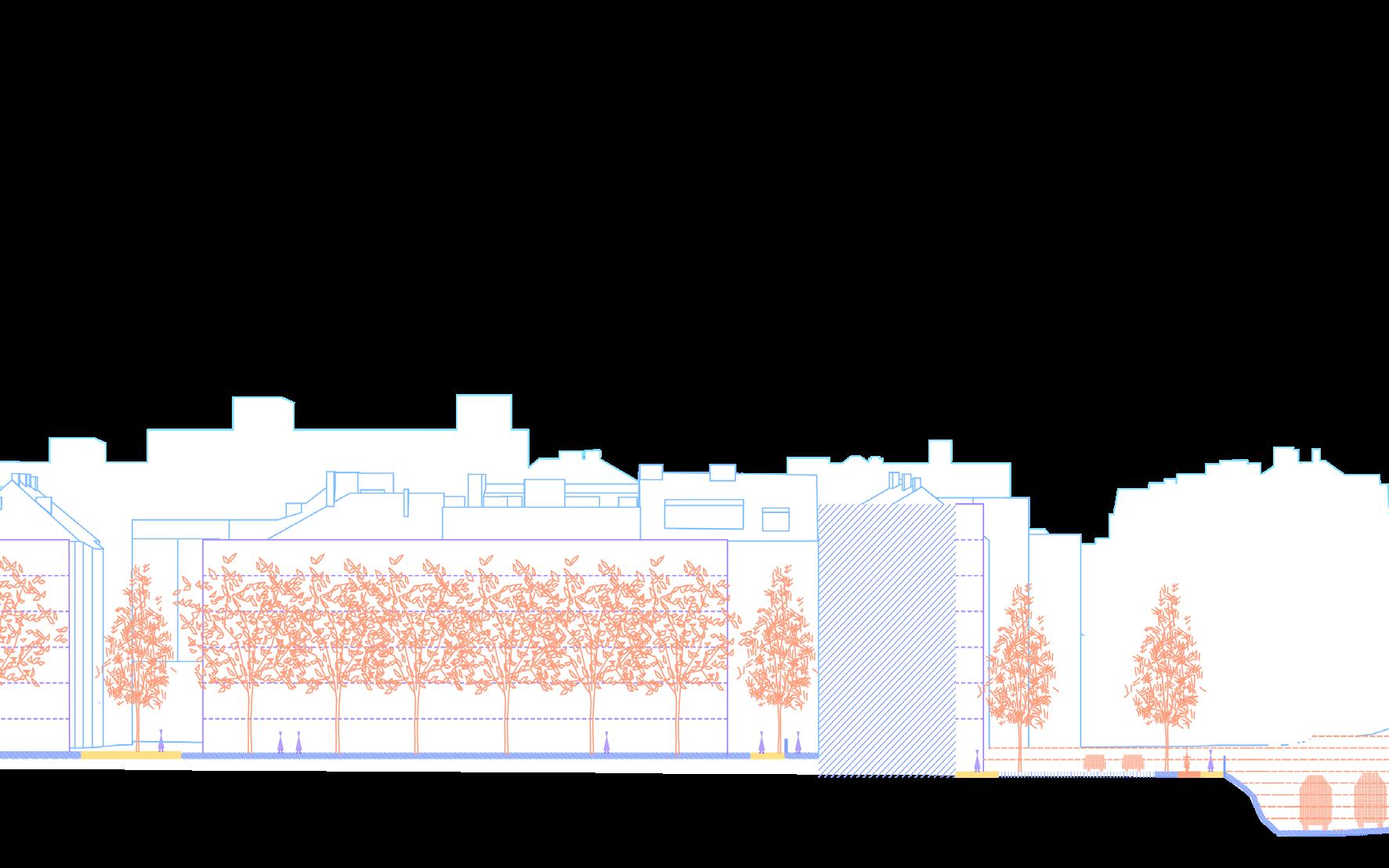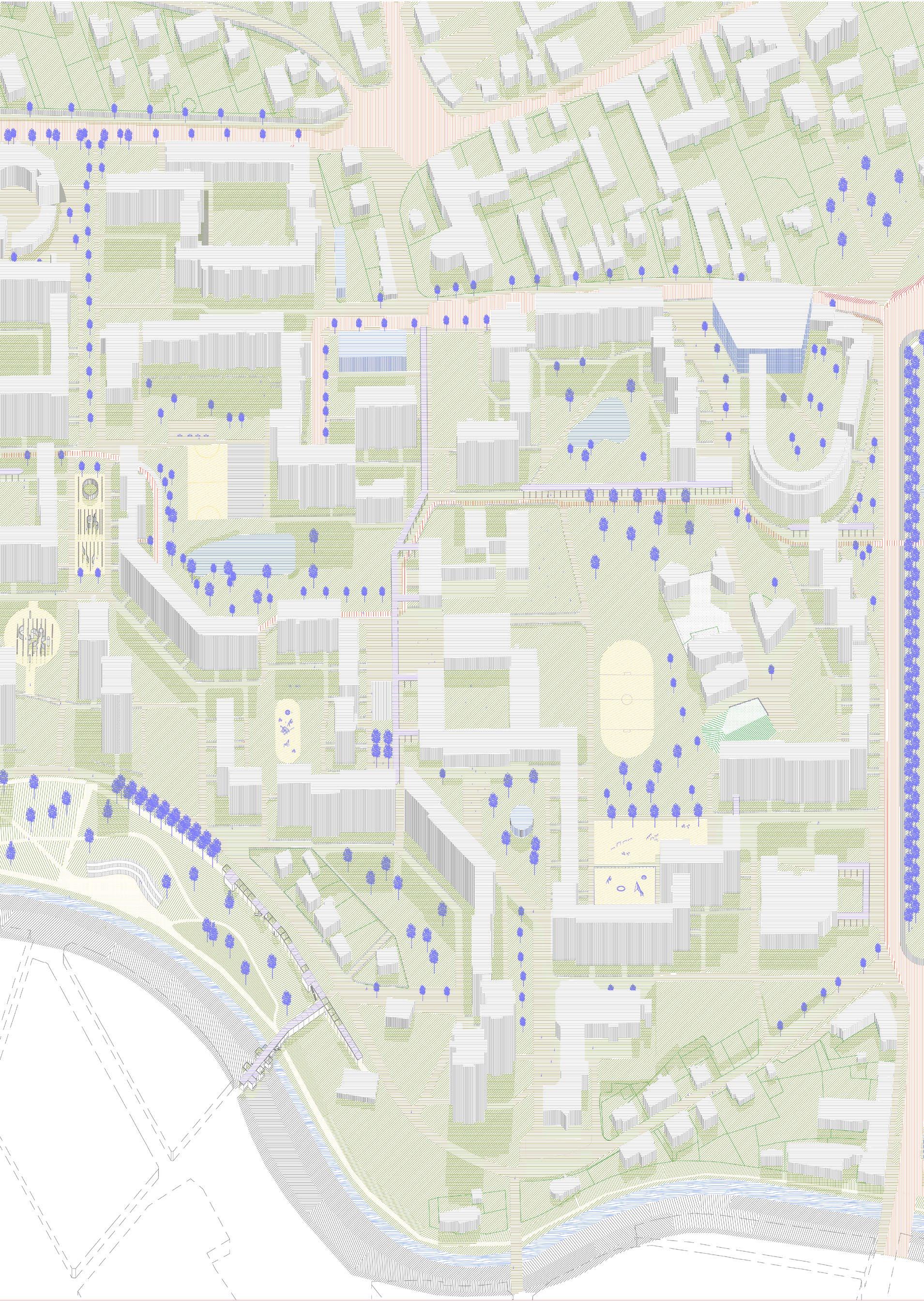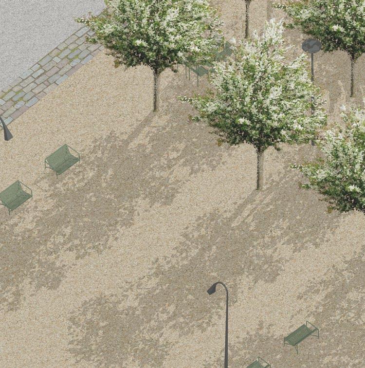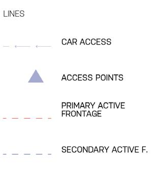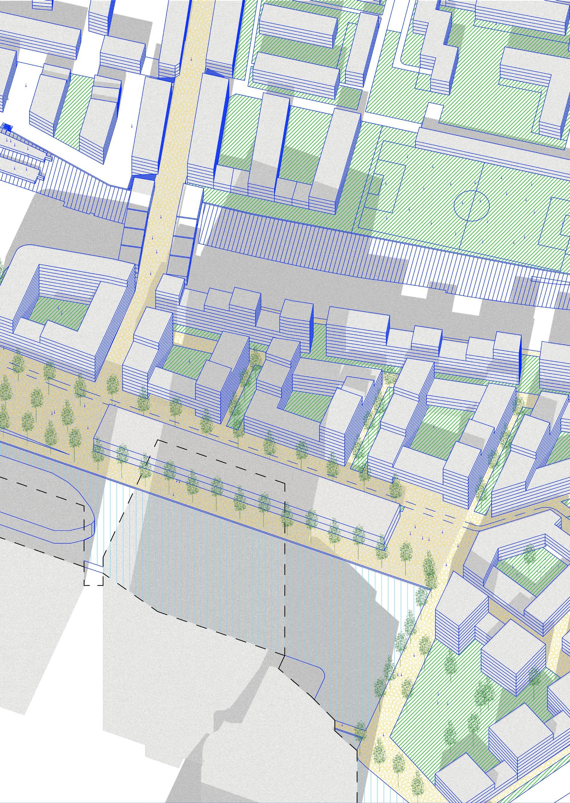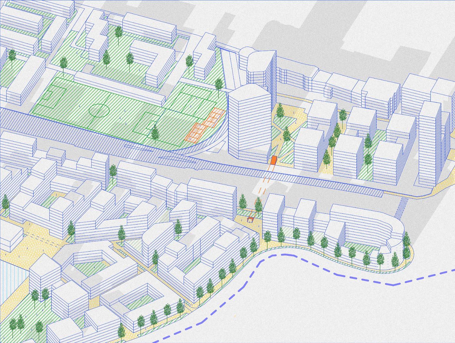 proposition tries to work with the height differences caused by roads rising up Canary Wharf by using sloped streets, maintaining the maximum level of accessibility for everyone while also establishing uninterrupted spaces to walk through Majority of the proposed streets in the south are pedestrian zones, mixing pedestrians together. Car access route is proposed in the central boulevard also a pedestrian zone, to allow deliveries and supplying necessary for the hall, school, shops and residential uses, with short-time parking in the street. residential buildings is not proposed in individual buildings but it is located north-eastern corner with direct connection to the Aspen Way for the whole development. Important is also the introduction of greenery into the streetsprivate and public, helping to cool the cities down in the summer and establishing of local people in caring for their surroundings thus increasing street safety.