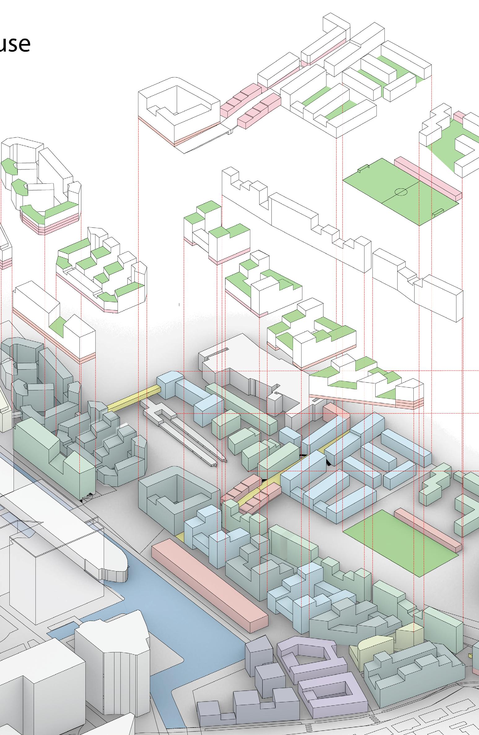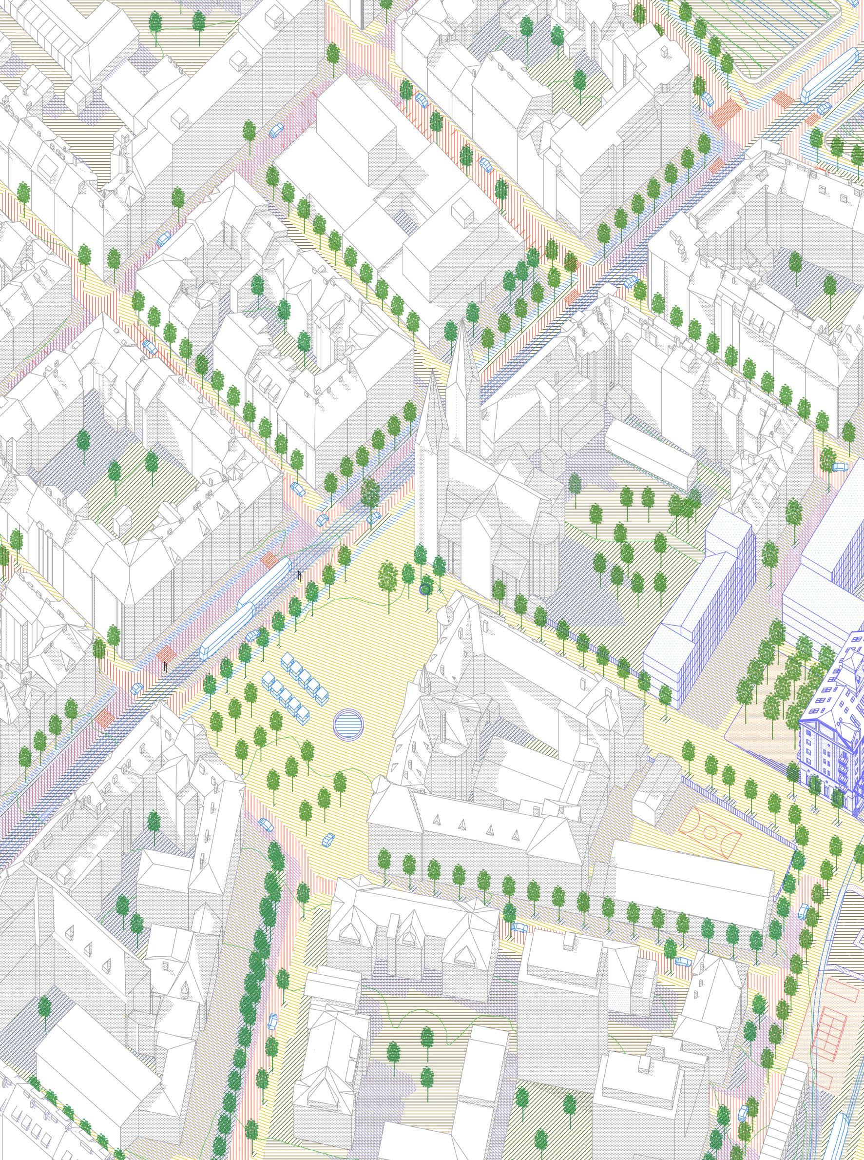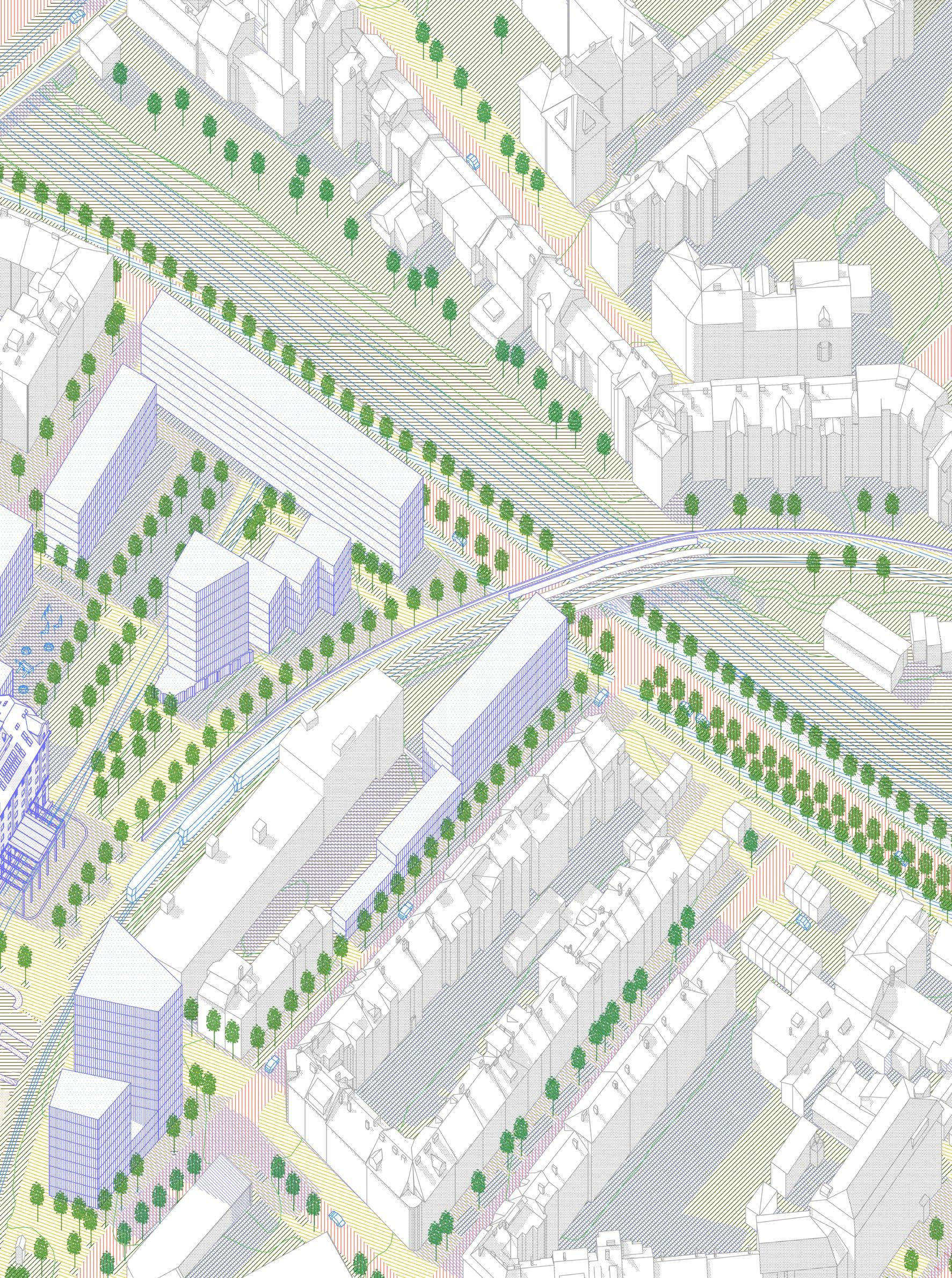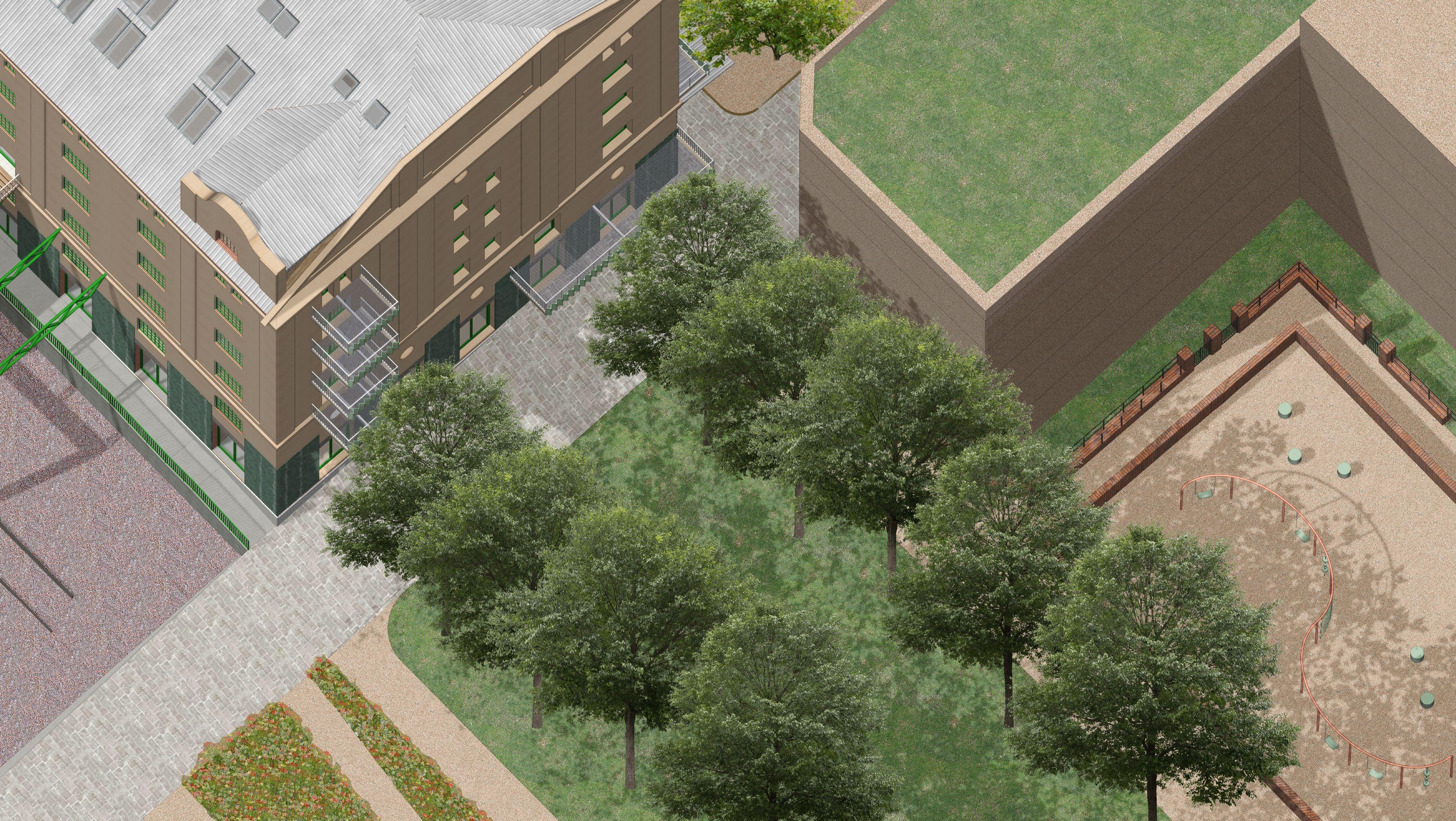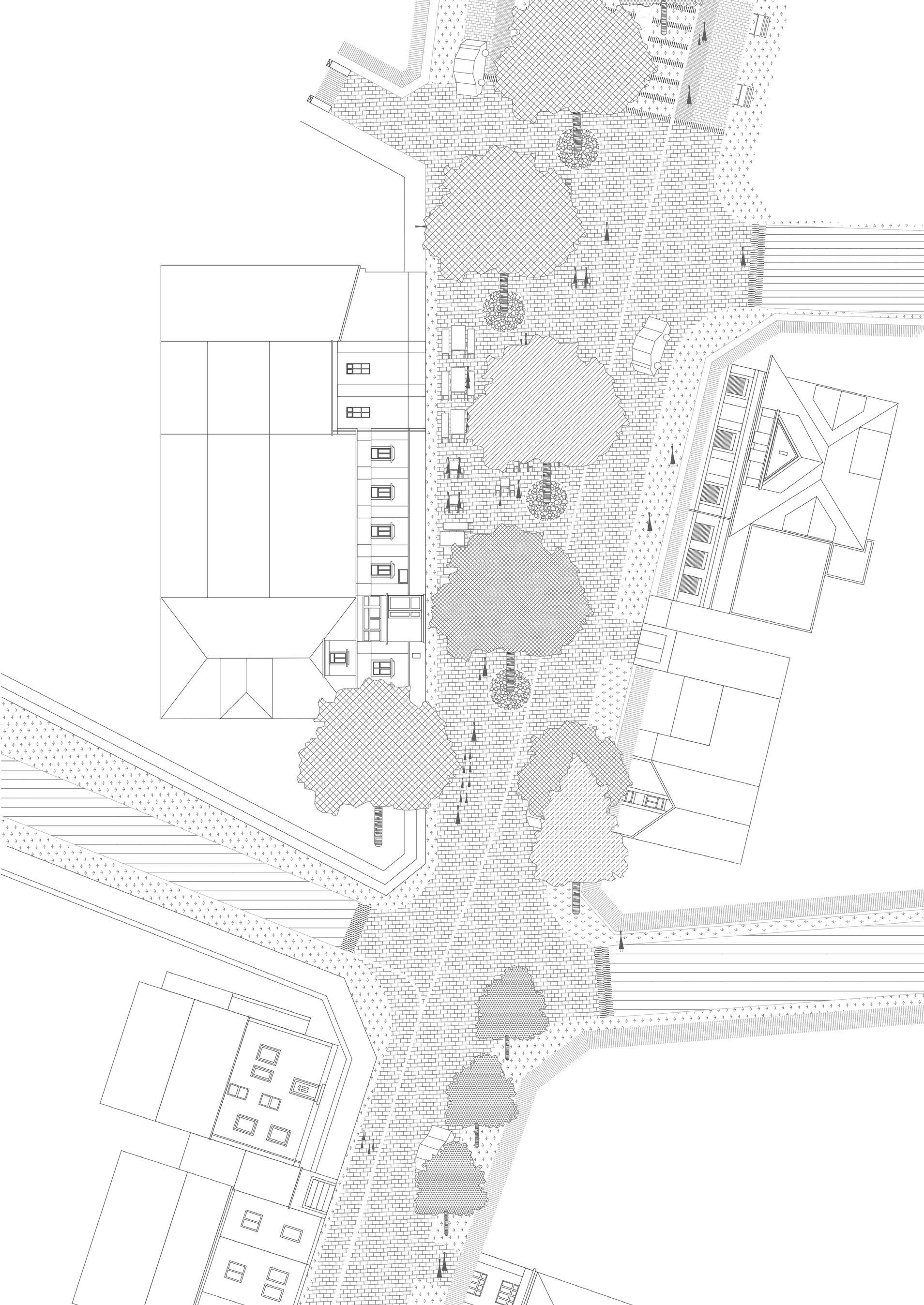 proposition tries to work with the height differences caused by roads rising up Canary Wharf by using sloped streets, maintaining the maximum level of accessibility for everyone while also establishing uninterrupted spaces to walk through Majority of the proposed streets in the south are pedestrian zones, mixing pedestrians together. Car access route is proposed in the central boulevard also a pedestrian zone, to allow deliveries and supplying necessary for the hall, school, shops and residential uses, with short-time parking in the street. residential buildings is not proposed in individual buildings but it is located north-eastern corner with direct connection to the Aspen Way for the whole development. Important is also the introduction of greenery into the streetsprivate and public, helping to cool the cities down in the summer and establishing of local people in caring for their surroundings thus increasing street safety.