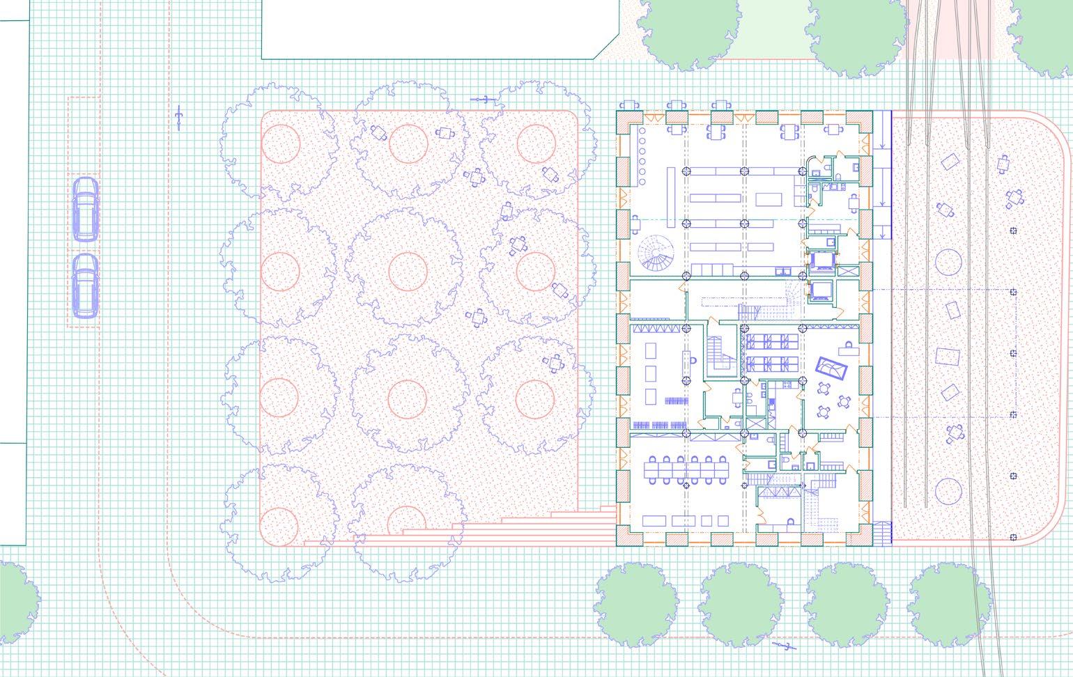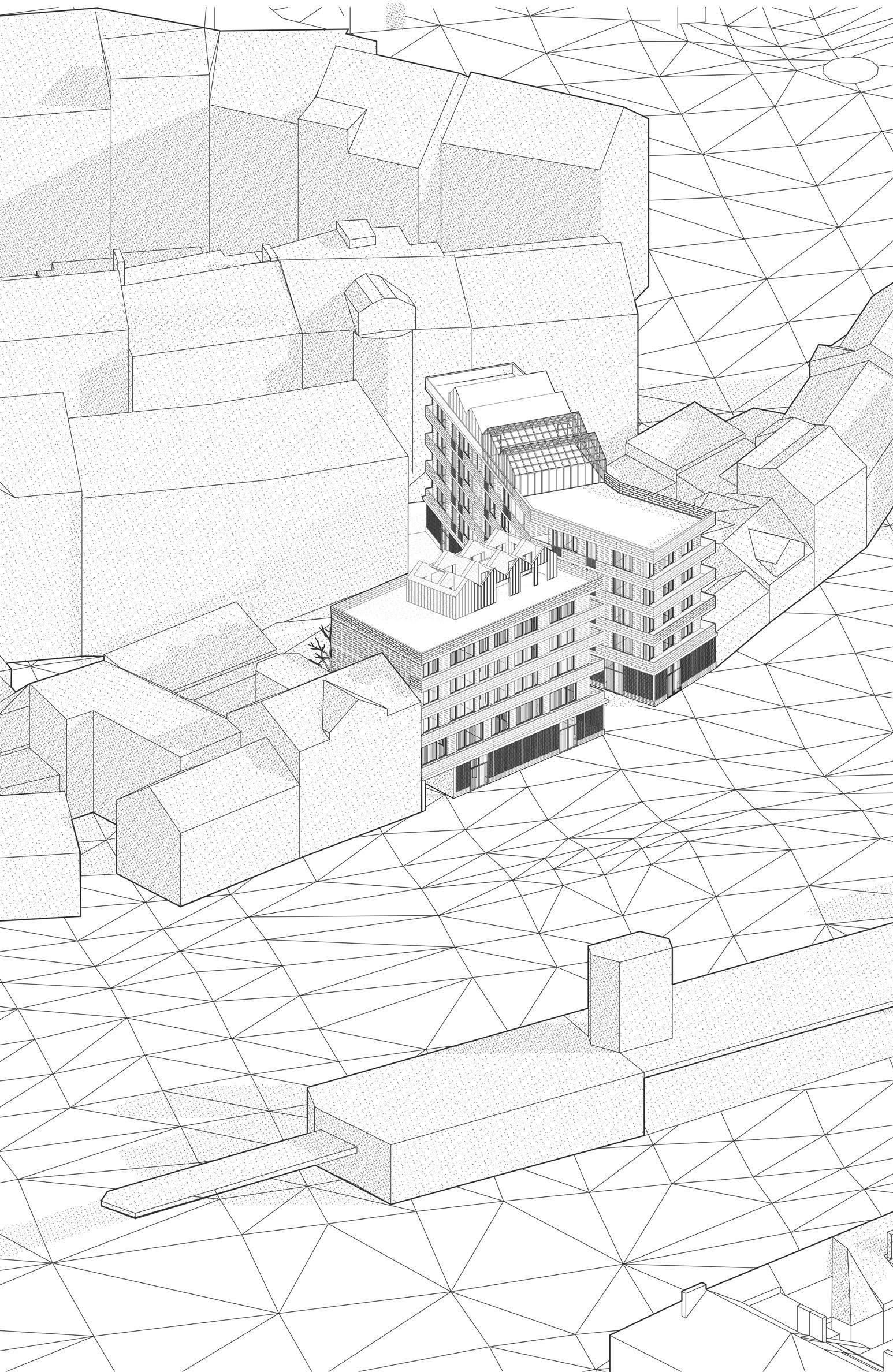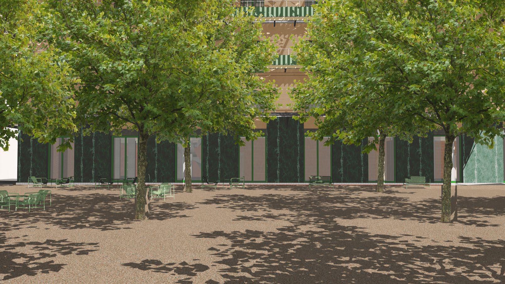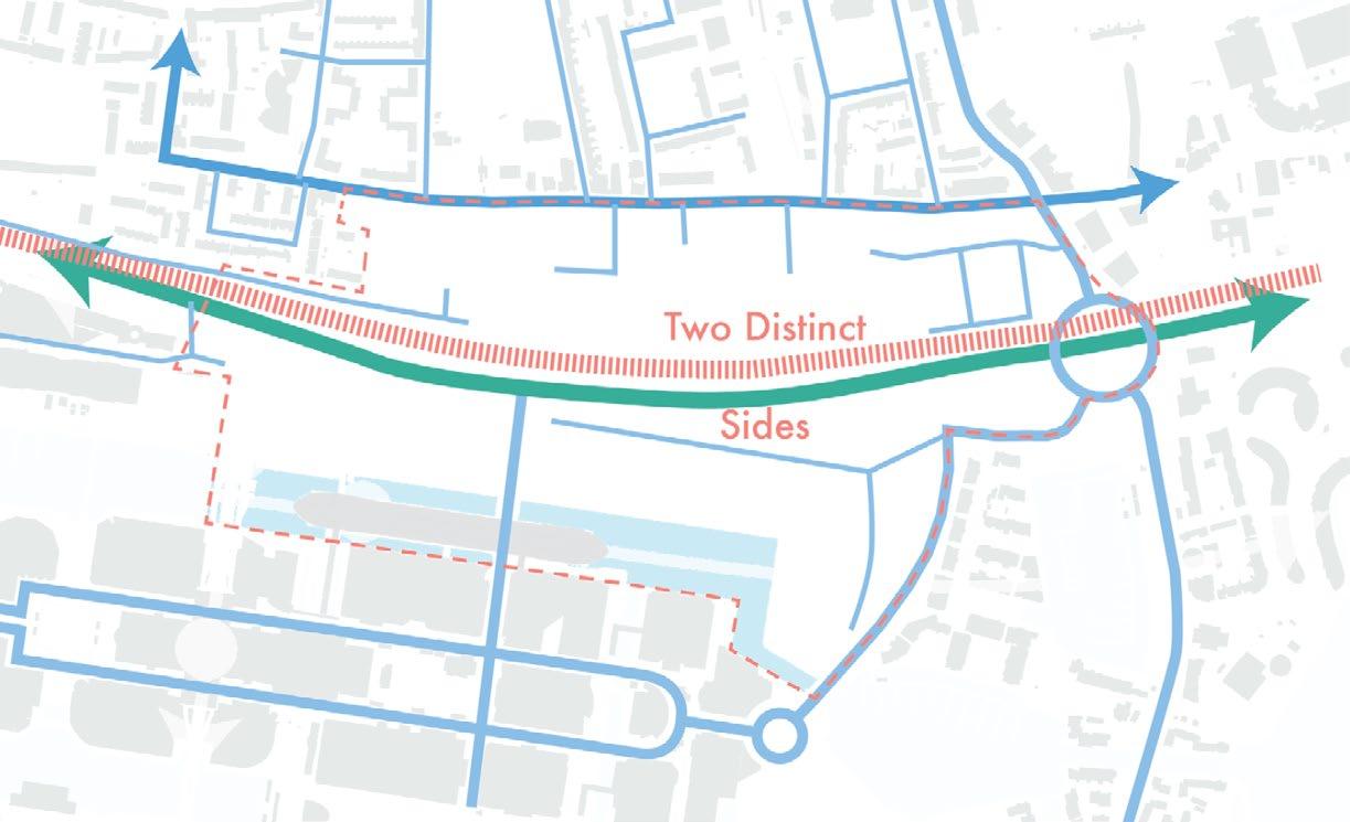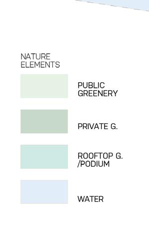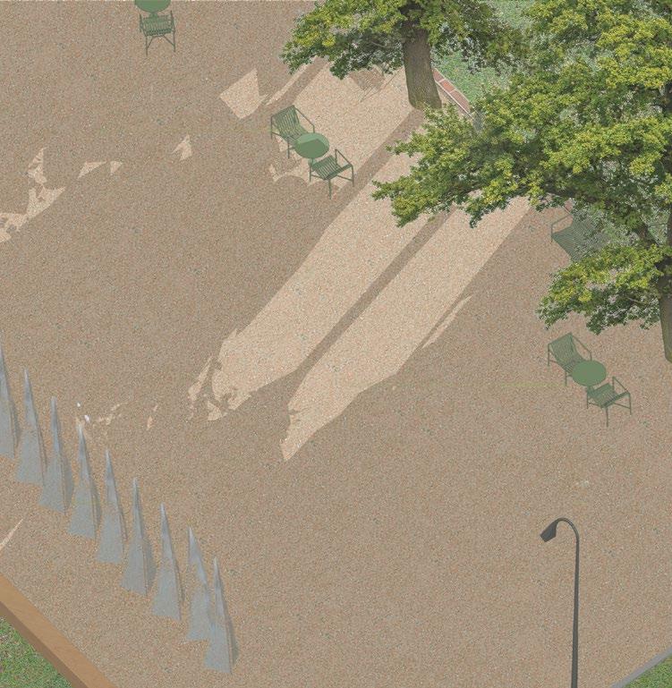 proposition tries to work with the height differences caused by roads rising up Canary Wharf by using sloped streets, maintaining the maximum level of accessibility for everyone while also establishing uninterrupted spaces to walk through Majority of the proposed streets in the south are pedestrian zones, mixing pedestrians together. Car access route is proposed in the central boulevard also a pedestrian zone, to allow deliveries and supplying necessary for the hall, school, shops and residential uses, with short-time parking in the street. residential buildings is not proposed in individual buildings but it is located north-eastern corner with direct connection to the Aspen Way for the whole development. Important is also the introduction of greenery into the streetsprivate and public, helping to cool the cities down in the summer and establishing of local people in caring for their surroundings thus increasing street safety.