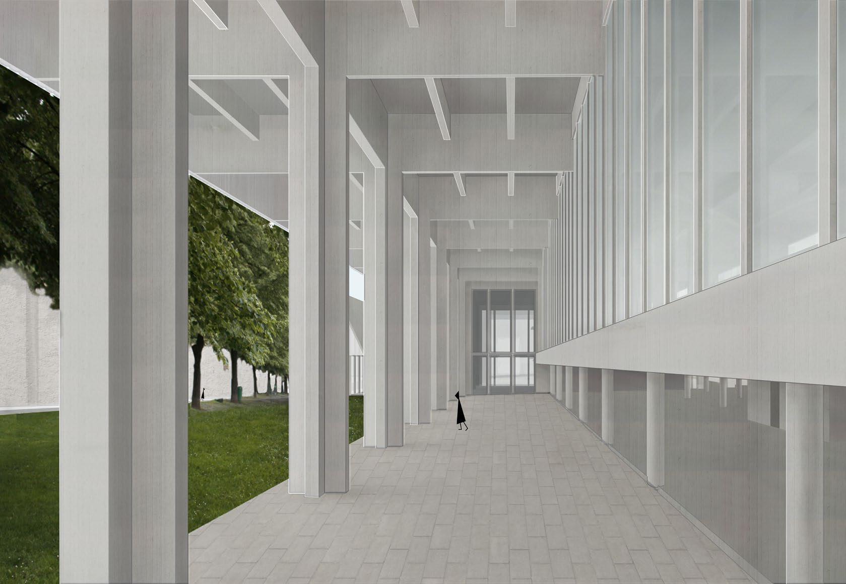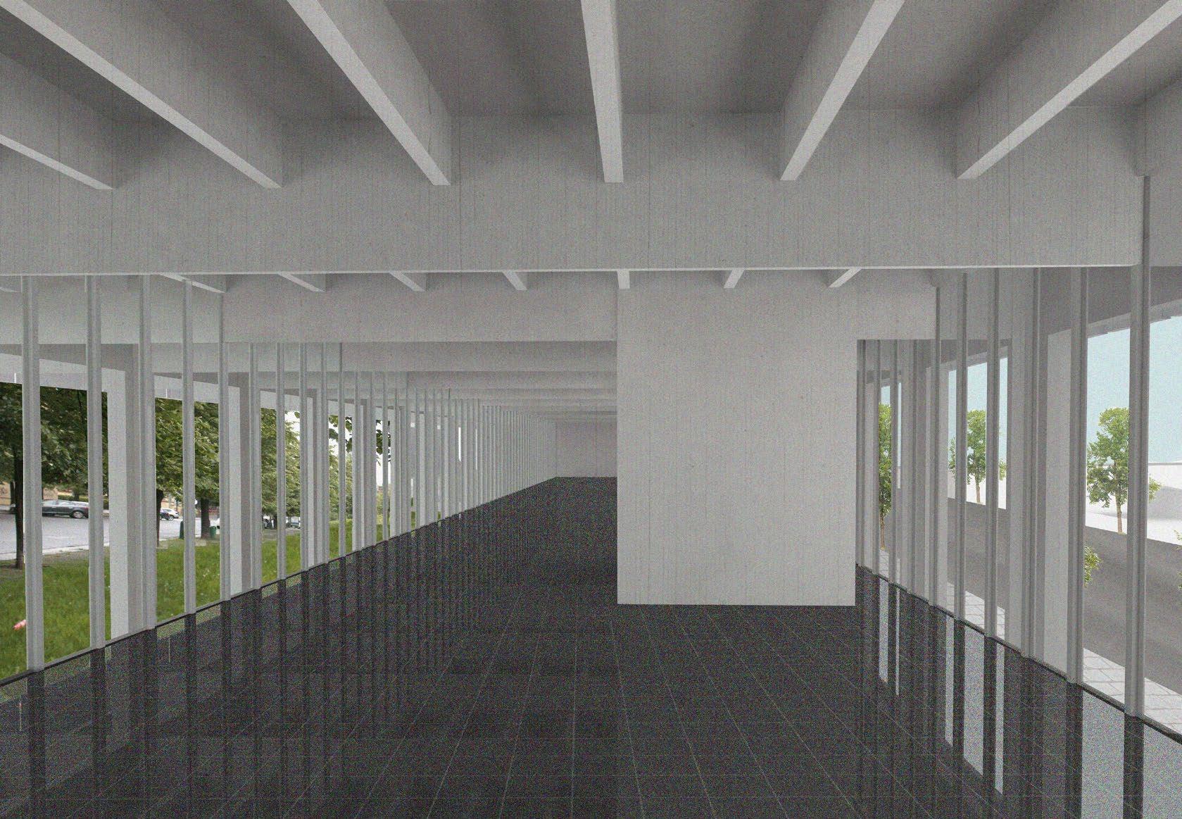 Today the area of the Ludvík Svoboda embankment and neighboring Lannova park is a chaotic space. Many things intersects right here but don´t work together. There are no connections but the same view over the Letenská slope. I tried to mend the broken connections by designing a smaller building for a cultural institution. It is a gallery for contemporary art which we currently lack in Prague. I take over a traffic situation designed by studio AOC with minor changes. The place was flattened to get rid of the height barriers among points of interest. In my design I equalize the value of a pedestrian with a car and make the whole area clearer. On both edges of the road are alleys. The longitudinal mass of the gallery creates a veil between the road and a park which adjoins the gallery from the south. The gallery itself only tries to create empty spaces. A contemporary artist works with any medium and should not be restricted in any way. There is an outdoor space for exhibitions, glazed galley on the first floor with clear windows and a large exhibition space with rooftop skylights with diffused light on the second floor. The face of the building is strict, formed by its structure with playful disruption in the form of the café. My goal was to design a non-limiting space which completes the urban structure of the embankment.