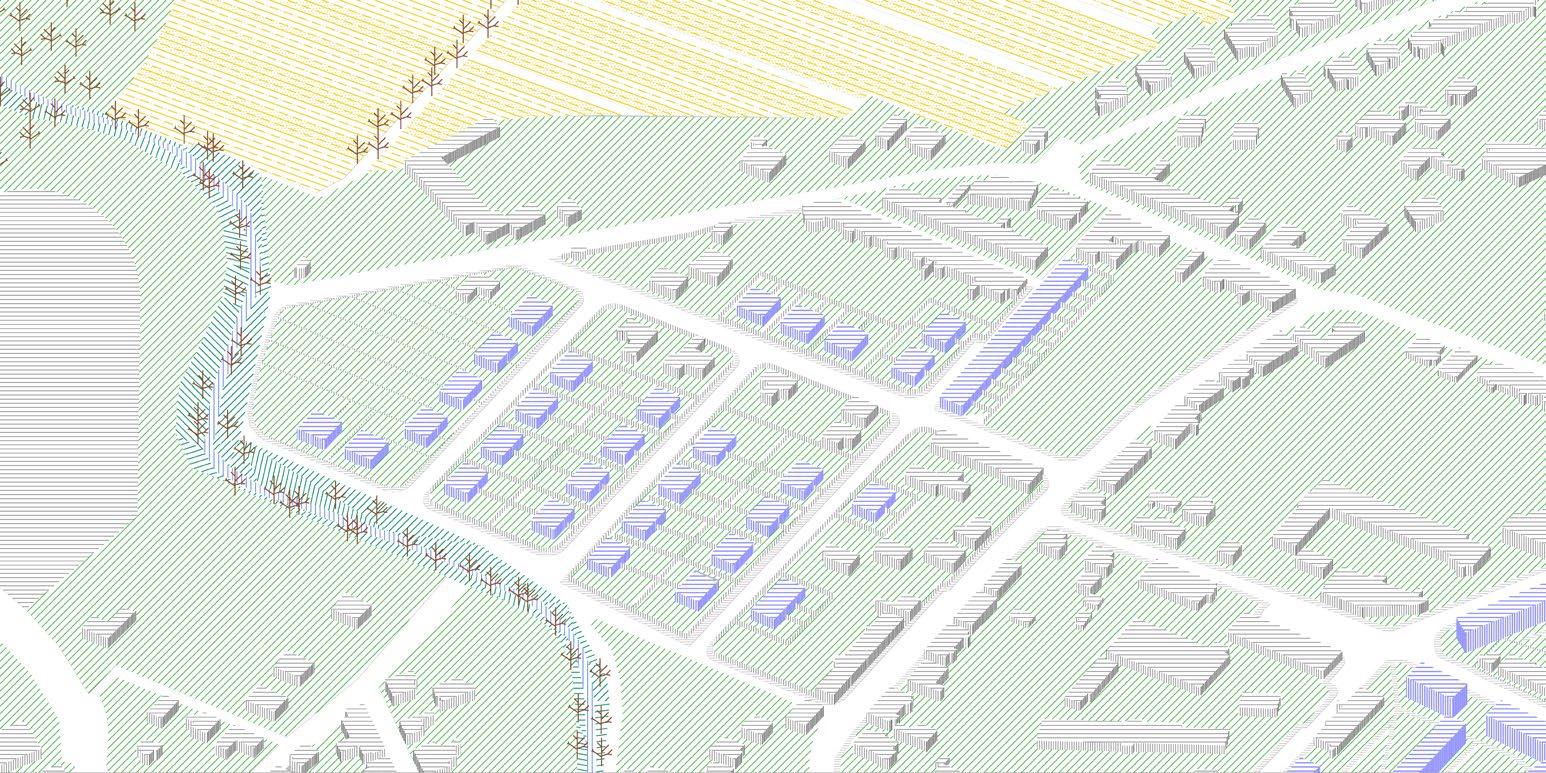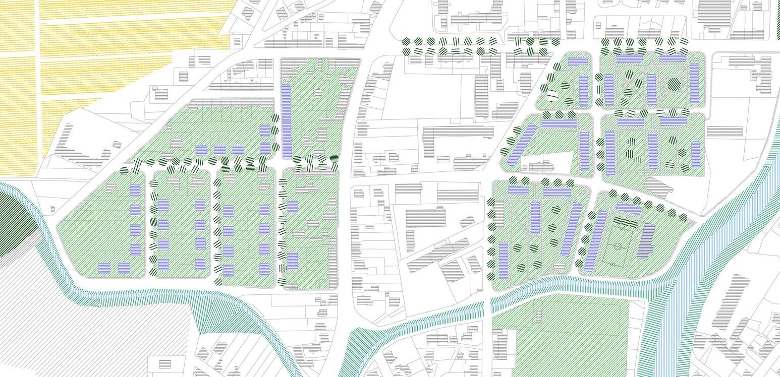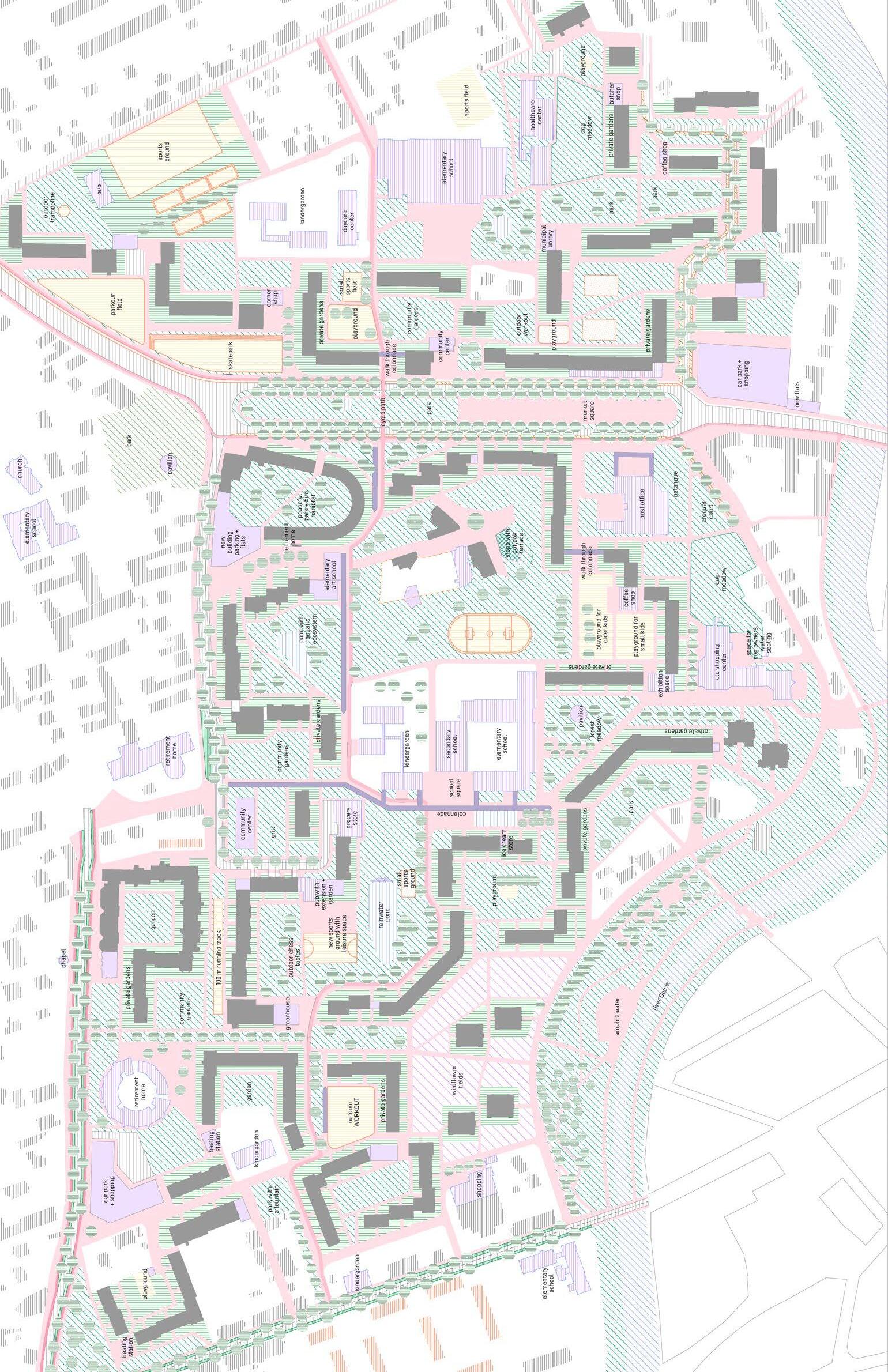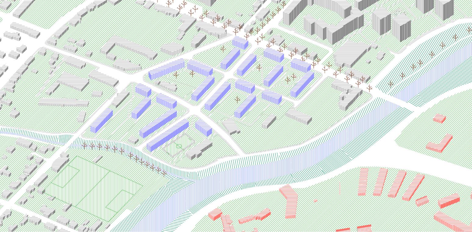 This studio assignment was the Opava city, in detail, the part of the city situated on the north bank of the Opava river. This area is characterized mainly by a development undergone in 1970´s when the original urban structure was demolished and replaced by modernist housing estate. Today is the area perceived negatively by local people and faces neglect alongside with decreasing quality of life. Our work is divided into 3 scales: macro, mezzo, and micro. The Macro scale is mainly dealing with overall organization of the city and ´plugging in´ our design into it. Its concerns are green infrastructure, landscape and its permeability, traffic and zoning. The Mezzo scale is dealing with the assigned part of the city: public transport, parks and proposed new development and amenities. The Micro scale deals with the mentioned housing estate ´Kateřinky´ in detail and its possible transformation into the original modernist idea of high-quality living in the green. In the Macro scale, we coordinate our designs with other urbanism students to propose a Green belt which is meant to establish a clear division and stop the urban sprawl. In our part of the city, this belt is located the closest to the existing development. We wanted to create more pressure towards using brownfield areas which are many present in the city, and towards densification in currently very low-density city. Because of the compact city size, we mainly encourage public transport and cycling. In our design we also propose a riparian forest, located in the south-eastern corner of assigned area, linked to the Opava river and re-established creek. This area is currently meant for individual housing development by the city. In the greatest detail we are dealing with the Kateřinky housing estate with the highest density in all Opava city but lowest number of amenities caused by lack of different functions than housing, traffic and leftover greenery.