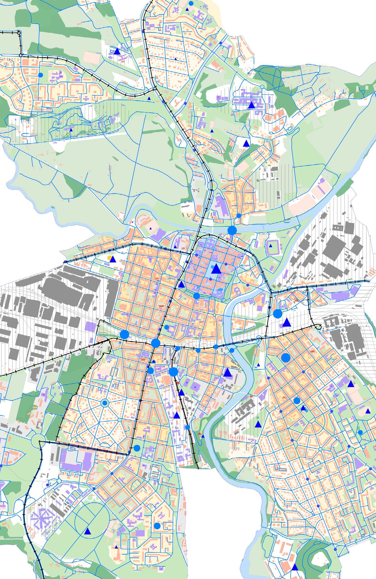 světle oranžová –30 os/ha / light orange –30 people/ha středně oranžová –40 os/ha / medium orange –40 people/ha tmavě oranžová –70 os/ha / dark orange –70 people/ha červená –90 os/ha / red –90 people/ha modrá –voda / blue –water fialová –nově navržená vybavenost / violet –proposed amenities žlutáindustriální plochy / yellowindustrial areas