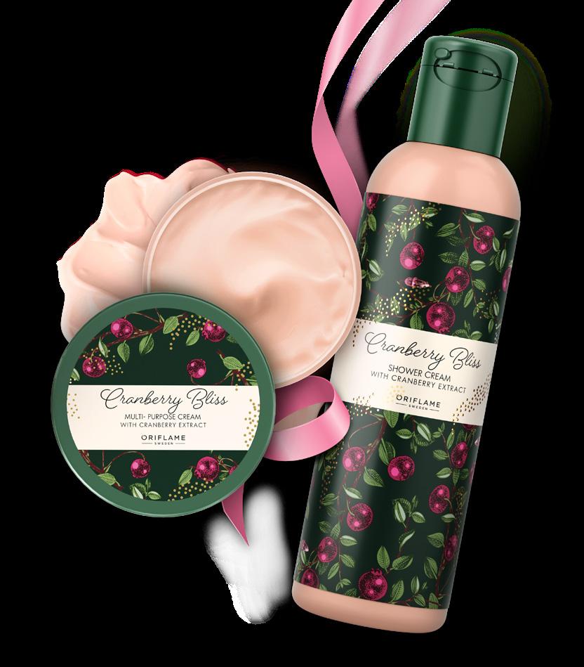 115 PONOVNO NA VOLJO NA VAŠO ŽELJO VEČNAMENSKA KREMA Vlaži in nahrani ter pripomore k voljni, mehki koži. Cranberry Bliss krema za prhanje 200 ml. 43119 4,00 € 2,49 € Cranberry Bliss večnamenska krema 150 ml. 43085 6,00 € 3,29 €