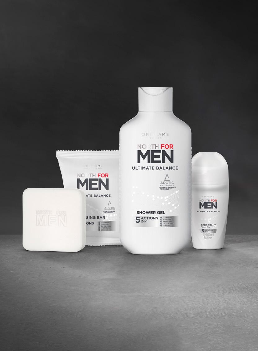 45 North for Men Ultimate Balance gel za prhanje 250 ml. 43932 7,50 € 4,49 € North for Men Ultimate Balance deodorant s kroglico 50 ml. 43927 4,00 € 2,49 € North for Men Ultimate Balance čistilno milo 100 g. 43929 3,50 € 1,99 € Deodorant s kroglico Gel za prhanje Čistilno milo S čistilno formulo Pomaga uravnovesiti in pripomore k zdravi koži Za 72-urno zaščito PREVZEMITE NADZOR S KOŽO V RAVNOVESJU Z mineralno tehnologijo: KAOLIN + NIKOTINAMID KAOLIN ima čistilne lastnosti za učinkovito čiščenje in odstranjevanje toksinov. NIKOTINAMID zmanjša hiperpigmentacijo in uravnoteži vlago kože.