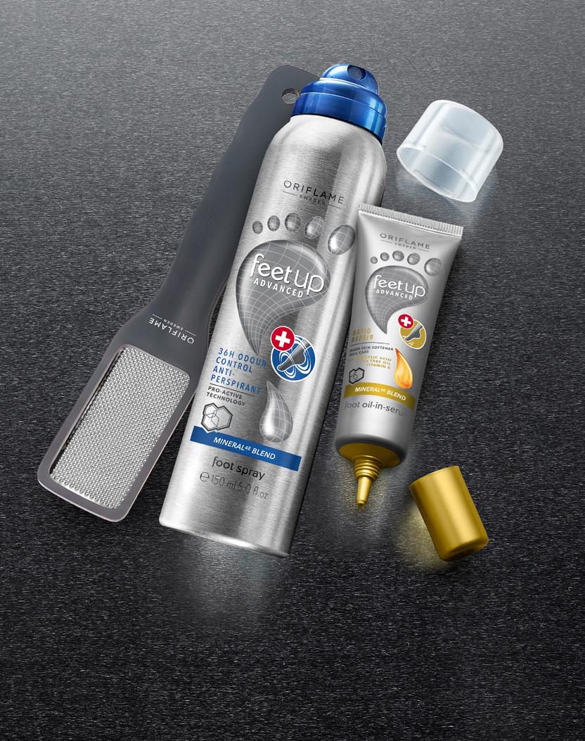 101 Feet Up Advanced 36-urni antiperspirantni sprej za noge za preprečevanje neprijetnih vonjav 150 ml. 33034 8,50 € 4,49 € Feet Up Advanced Rapid Repair oljni serum 30 ml. 35835 6,50 € 3,79 € Advanced pila za stopala iz nerjavečega jekla Mere: 19 x 3,8 cm. Material: nerjaveče jeklo, 50 % recikliran PS 40778 5,00 € 2,99 € ∆ Klinično preizkušeno. Intenzivno vlaži; koža je mehkejša že po prvi uporabi* PILA ZA STOPALA IZ NERJAVEČEGA JEKLA Poskrbite za gladkost in udobje stopal *Preizkušeno na 67 uporabnikih s trdo kožo na stopalih†. Pomaga enostavno odstraniti suho, otrdelo kožo in razkrije gladka, mehka stopala. OLJNI SERUM Preprečuje neprijetne vonjave DO 36 UR ∆ SPREJ ZA STOPALA IN ČEVLJE