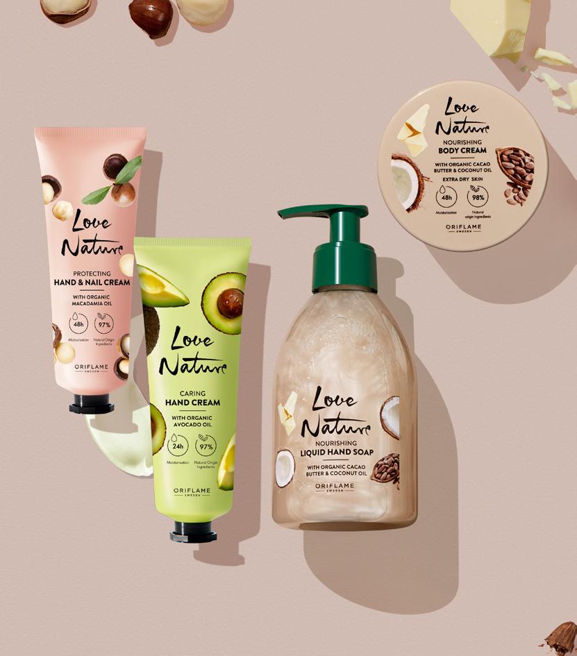 Bogata, primerna za zelo suho kožo z 98 % sestavin naravnega izvora. Zagotavlja 48 ur vlage∆. TEKOČE MILO ZA ROKE OMEJENA IZDAJA Sestavine naravnega izvora Lahka vlažilna formula za podporo kožni pregradi KREMA Z OLJEM MAKADAMIJE Pomaga zaščititi roke in nohte pred izsušitvijo Bogastvo narave ∆Klinično testirano KREMA Z OLJEM AVOKADA Biorazgradljiva, pH uravnotežena formula očisti in vlaži kožo.