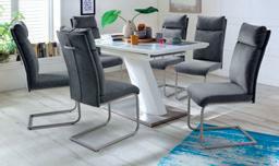 Miza, lakirana bela, osnovna plošča: brušeno jeklo, mere: 140/180x80 cm, na voljo v različnih velikostih, 195891/1. Stol, barva: ženiljska, antracit, ogrodje: brušeno jeklo, ŠxVxG: 45x106x62 cm, na voljo v različnih barvah, 195891/2.