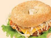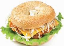 PIŠČANČJI BAGEL sestavine; bagel s sezamom, piščančji burger, omaka, solata, paradižnik in zelje