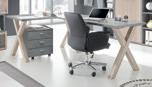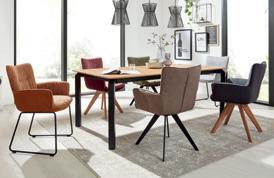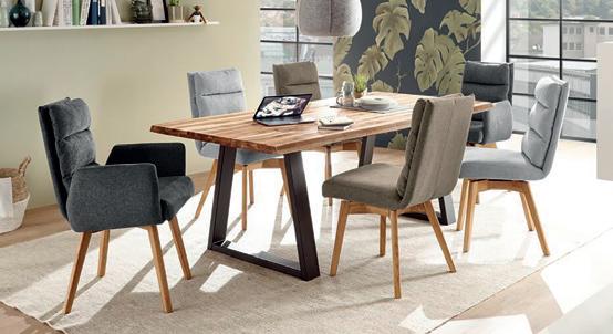 Miza, oljen, masiven hrast, rob drevesa, črno ogrodje, mere: 200x100 cm, 195886. Stol, tkanina, svetlo siva, ogrodje: oljen, masiven hrast, vrtljiv za 360°, mere: 43/48x50x43 cm, na voljo v različnih barvah, 195886/1. Stol, vklj. nasloni za roke, namesto 249,99 zdaj 199,-, 195886/3