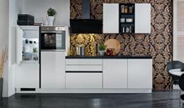 Kuhinja, alpinsko bela, 300x120 cm, vklj. z vsemi navedenimi inoks električnimi aparati, na voljo v različnih postavitvah in barvnih kombinacijah. Hladilnik in pomivalno korito za doplačilo, 195397/199787