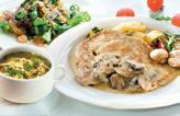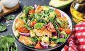 Solata s piščancem Zelena solata, ocvrt piščančji file, kuhano jajce, popečene kruhove kocke, ameriški preliv
