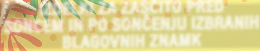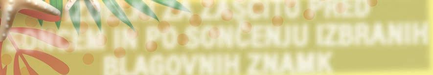 PREJŠNJA CENA 9 , € 45 PREHRANSKO DOPOLNILO MAGNEZIJ MULTI ESSENCE • v granulah za neposredno uporabo, zagotavlja potrebne količine magnezija in vitaminov B kompleksa za zadostitev povečanih potreb telesa 20 vrečk 8,€ 99 50% ZNIŽANA CENA PREJŠNJA CENA 18 , € 03 OLJE ZA PRHANJE PH5 • za dnevno čiščenje občutljive in suhe kože telesa • visok delež negovalnih lipidov ponovno dovaja koži maščobe • s pumpico 400 ml 1,€ 07 50% ZNIŽANA CENA PREJŠNJA CENA 2 , € 14 SODA BIKARBONA • vsestranska uporaba • ne vsebuje aluminijevih derivatov 400 g 3