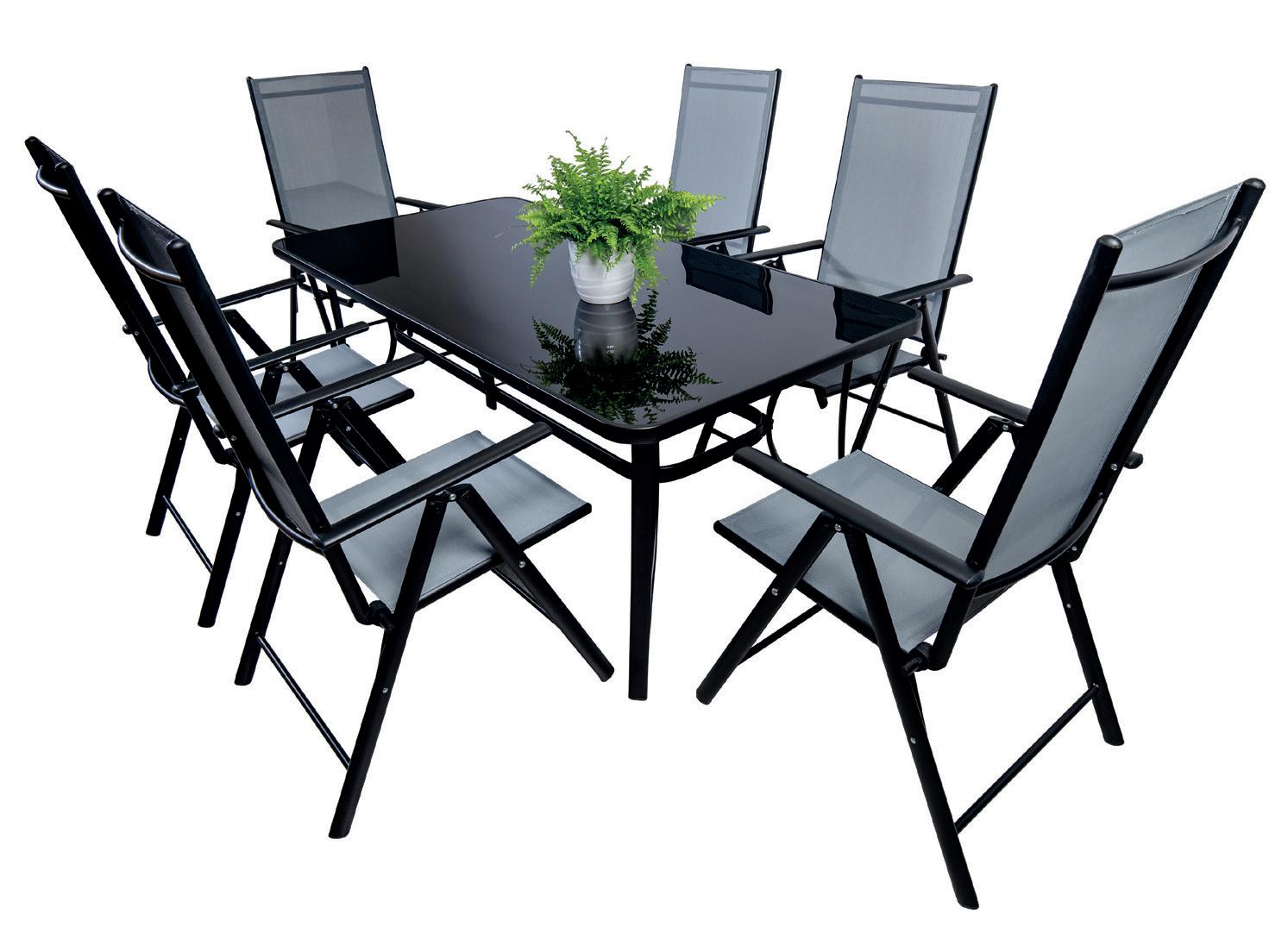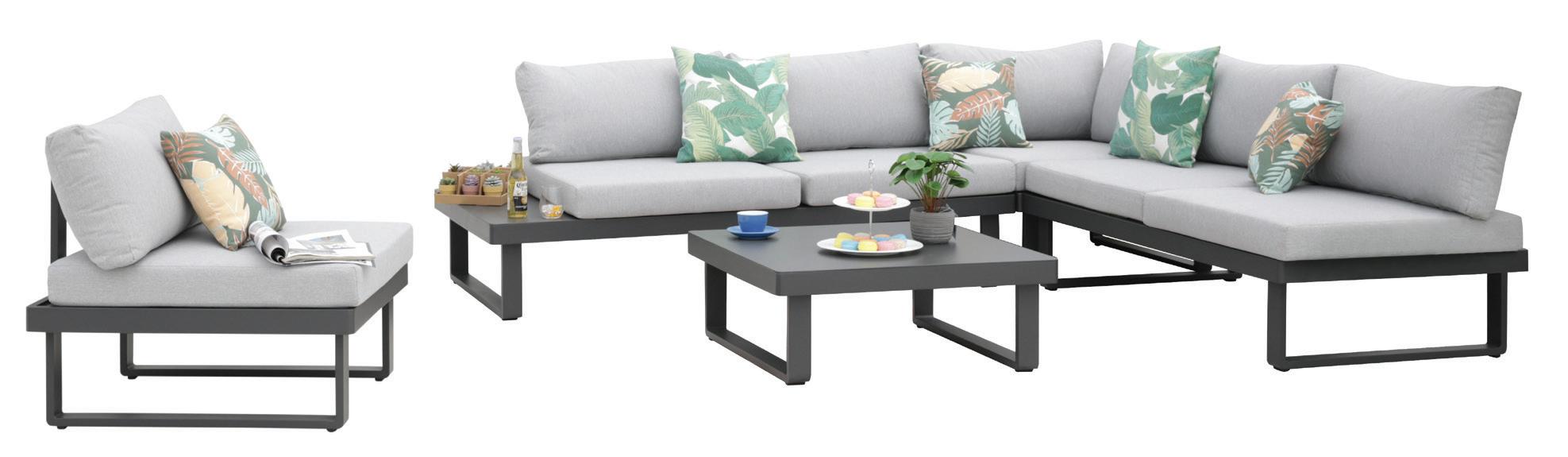 KOVINSKA VRTNA GARNITURA MQ POTENZA Stol mere (d/g/v): 72/79x69/75 cm, kotni del (d/g/v): 79x79x69/75 cm, dvosed (d/g/v): 144/79x69/75 cm, dvosed s stransko mizico (d/g/v): 174x79x69/75 cm in kavno mizico (d/š/v): 79/79/32 cm, debelina blazin 13 cm.