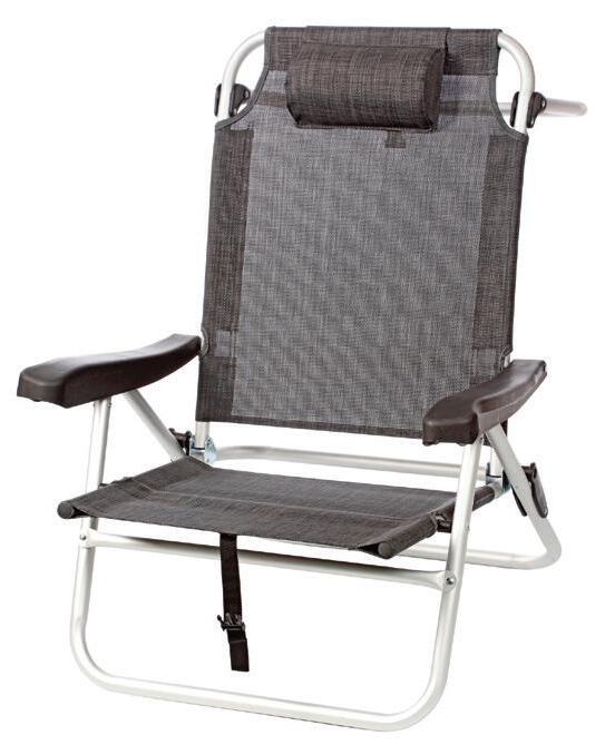 Aluminijast stol za na plažo z naslonom za hrbet v 4 položajih in vratno blazino za dodatno udobje, lahek in enostaven za prenašanje, udobni nasloni za roke, mera: 64 x 63 x 28/82(v) cm, mera zložen: 74/66/12 cm, teža: 3,6 kg.